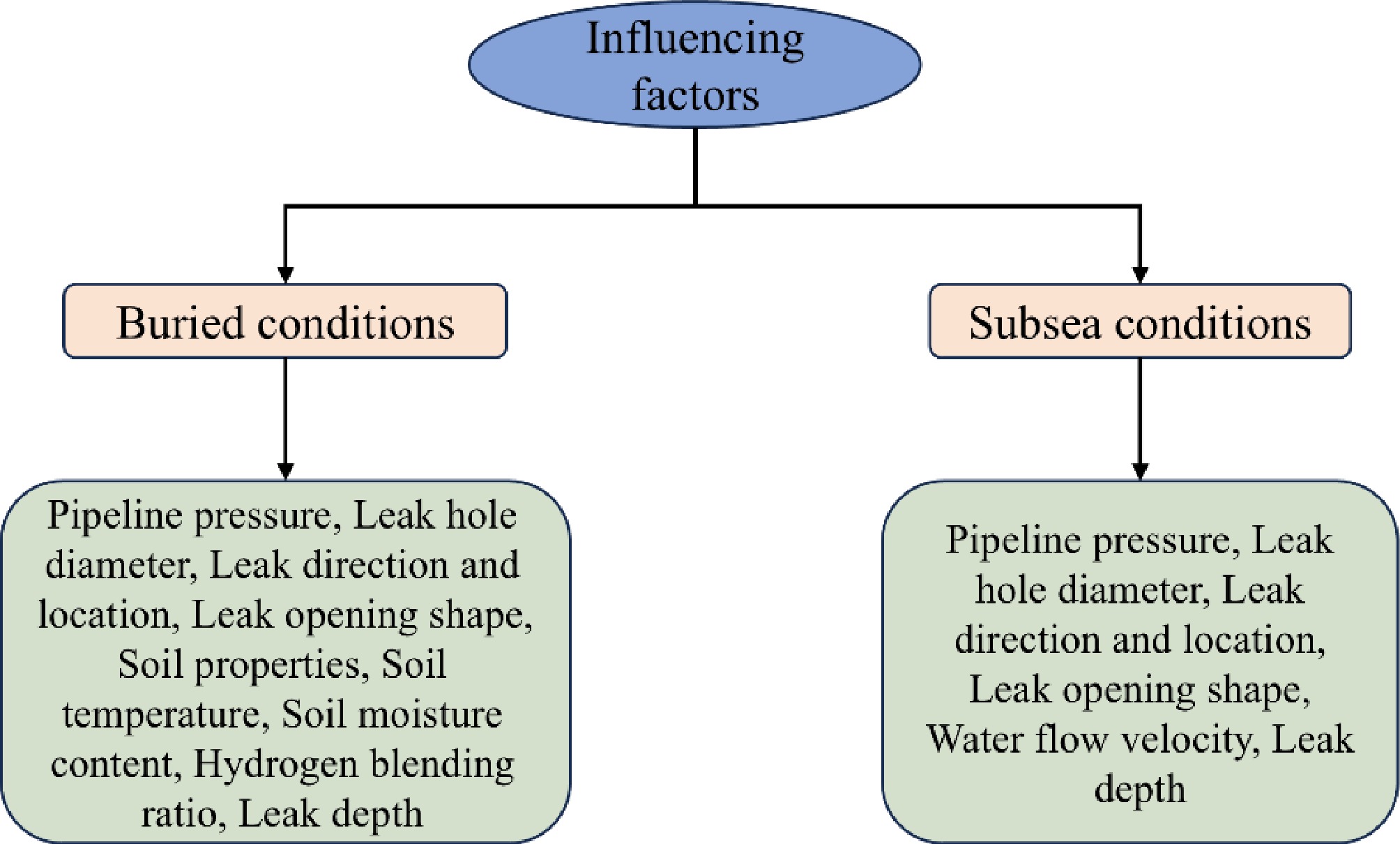 Influencing factors of natural gas and hydrogen-blended natural gas leaks in buried and subsea environments.