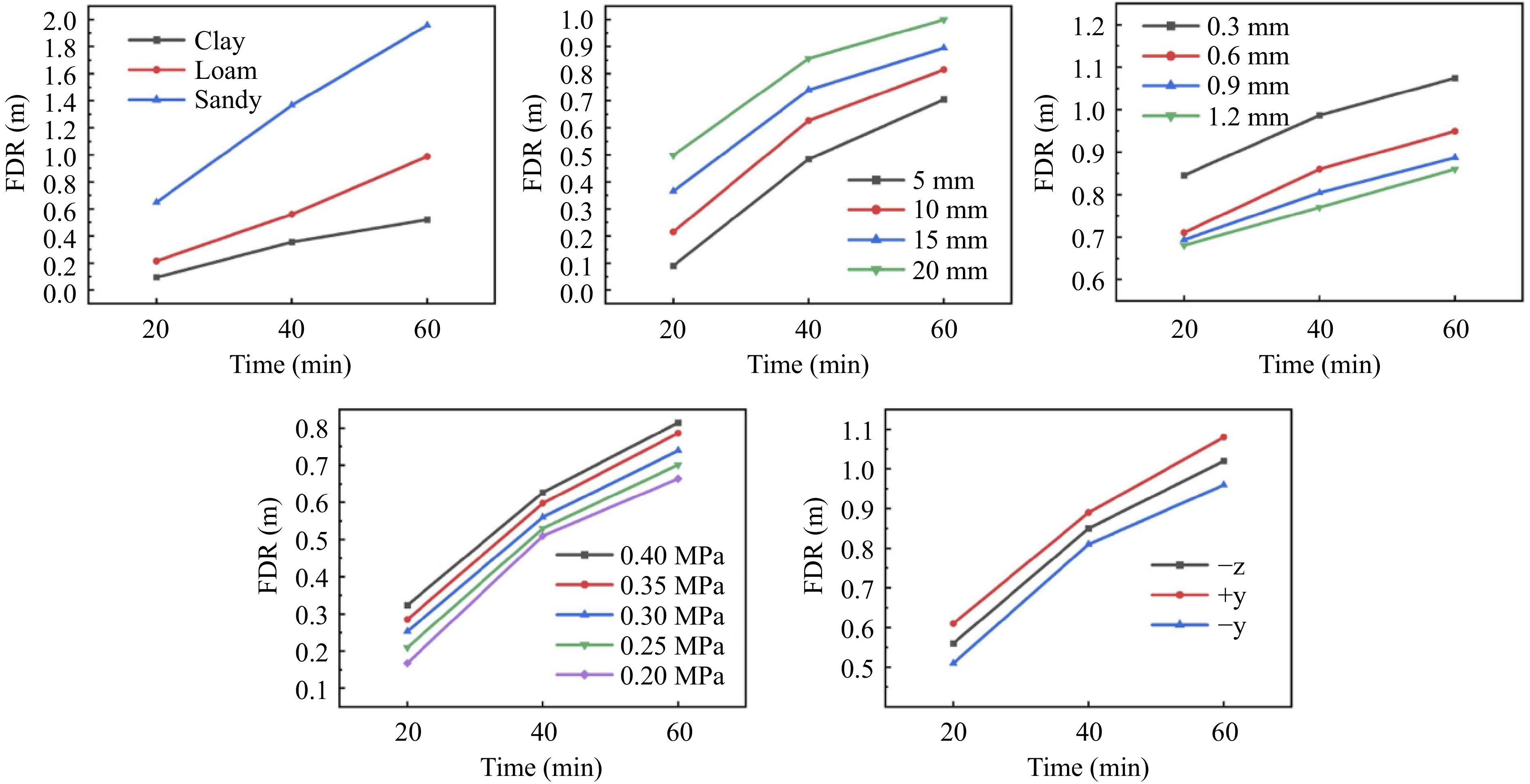 The time it takes for CH4 to reach the ground after a leak (FDT), the maximum distance it can spread horizontally from a buried pipeline (GDR), and the radius of the hazardous zone on the surface caused by the gas spreading (FDR) are critical parameters for assessing the severity of CH4 leak incidents. Liu et al.[41] employed numerical simulations to explore how factors such as pipeline pressure, burial depth, leak direction, soil characteristics, and leak orifice diameter influence FDT, GDR, and FDR. Their findings indicated that larger leak orifice diameters and higher leak pressures resulted in shorter FDT and larger GDR, but had minimal effect on FDR. Increasing burial depth raised FDT, GDR, and FDR, while variations in leak direction had a negligible impact on all three parameters. Soil properties played a substantial role in defining the hazardous boundary: the FDT in sandy soil is 1/8 that of loam soil and 1/15 that of clay soil; the FDR in sandy soil is 1/3 that of loam soil and 1/10 that of clay soil; the GDR in sandy soil is 1/6 that of loam soil and 1/11 that of clay soil (Fig. 6).