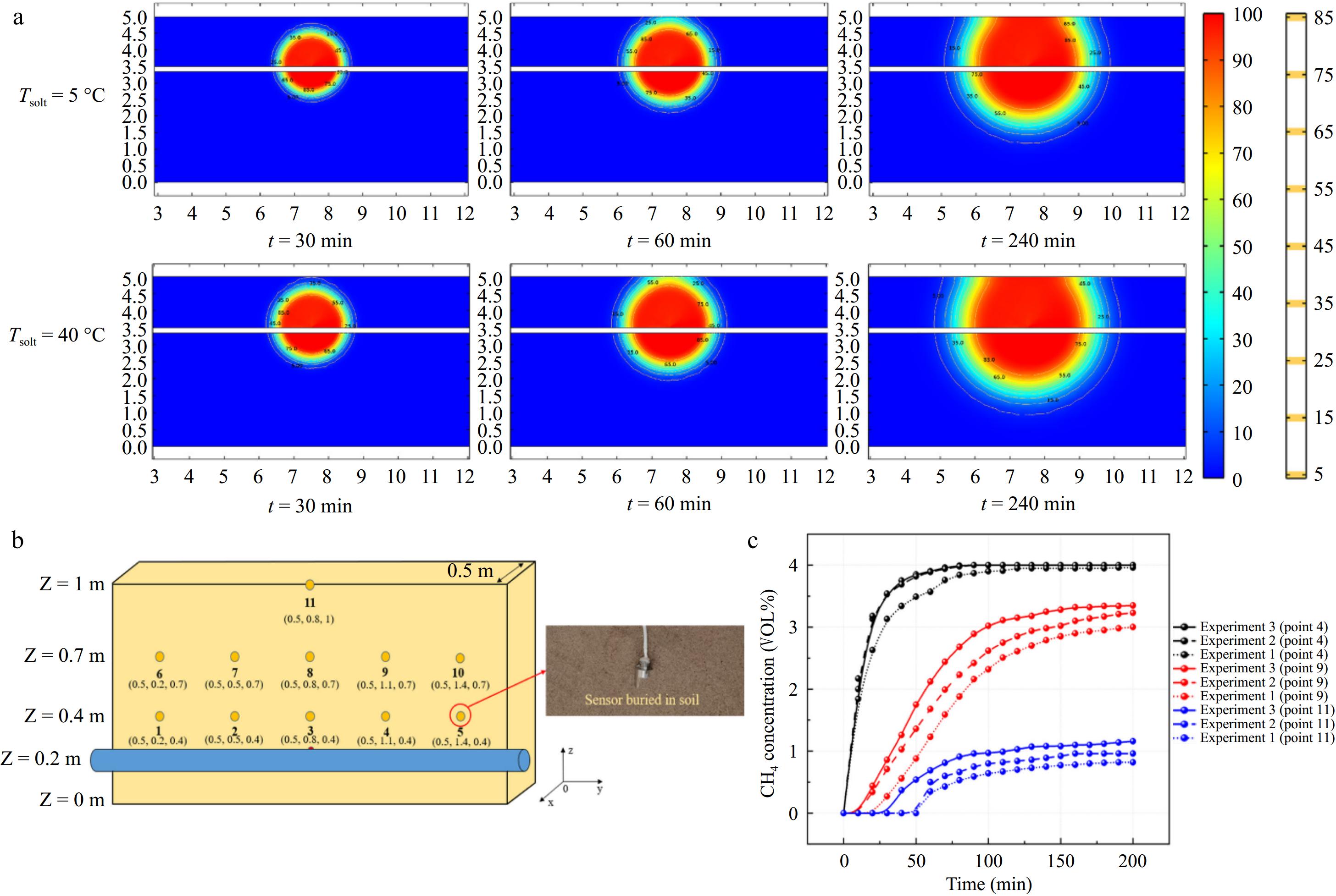 (a) Contour of methane concentration changes with time at different soil temperatures obtained from simulations. (b) Layout and number of sensors. (c) Comparison of concentrations at different temperatures from experiments (Experiment 1: T = 5 °C, Experiment 2: T = 15 °C, Experiment 3: T = 25 °C)[20].