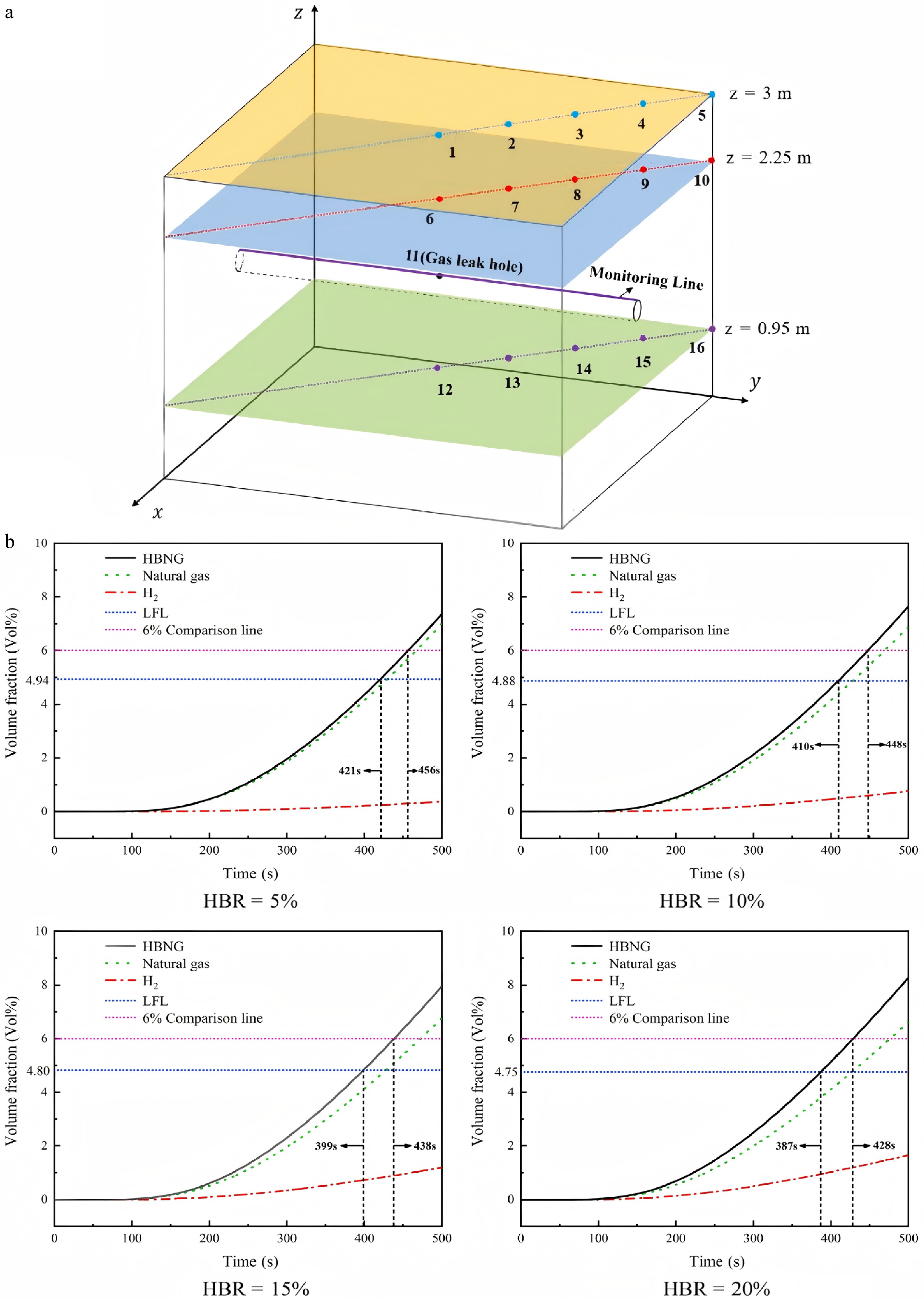 (a) Layout of leakage ports and monitoring points. (b) Changes in the concentration of H2-doped CH4 at monitoring point 2 within 500 s[51].