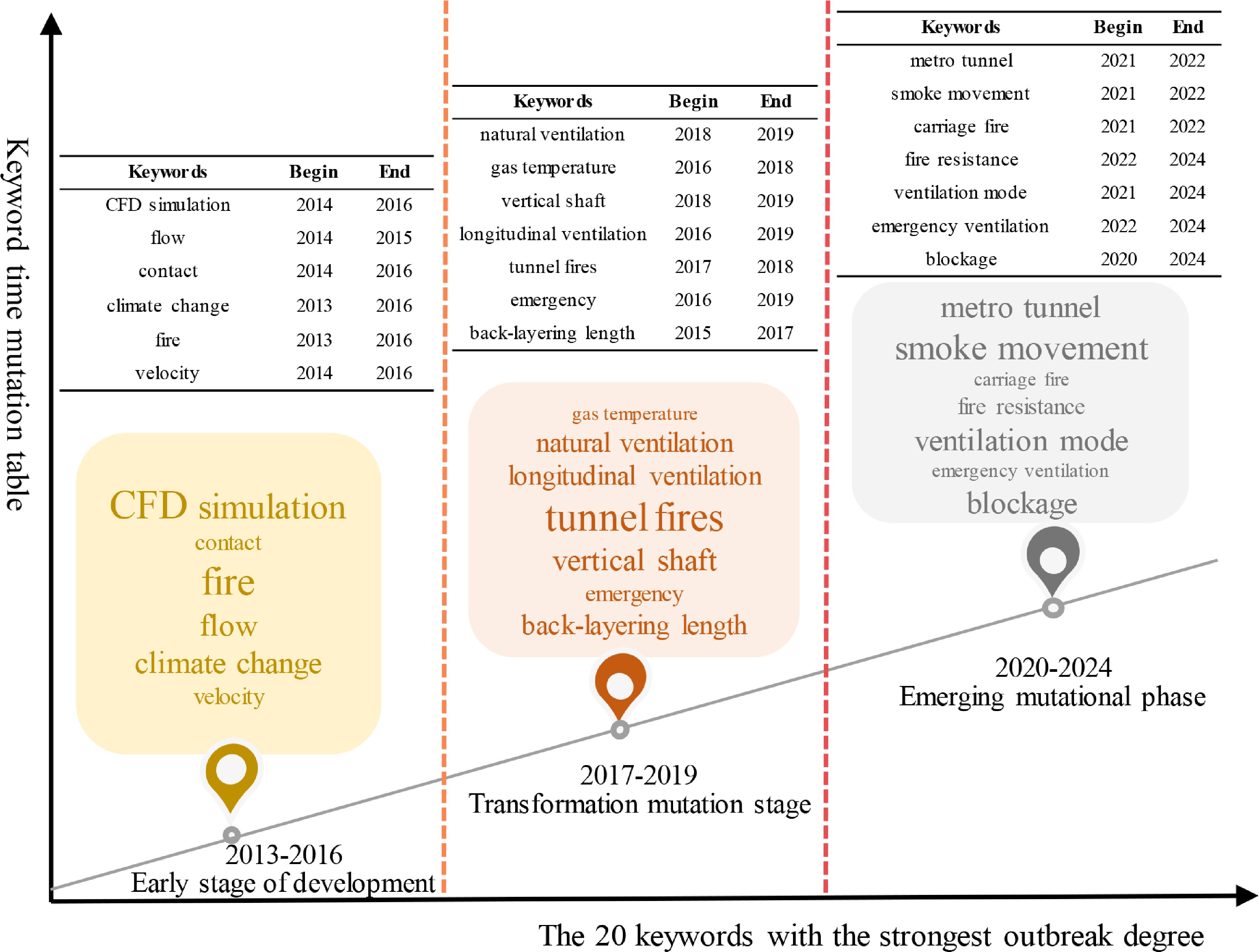 2020−2024 was an emerging mutation stage, which was more obvious, extending from 'natural ventilation' to 'blockage ventilation' and 'ventilation mode'. These two keywords were in an emerging mutation state. During this period, the emphasis switched to tackling problems including blocked ventilation and optimizing ventilation modes. Research on the utilization of emergency ventilation systems and their impact on smoke flow in tunnels grew significantly. In the field of subway fire safety, new research areas, including blocking ventilation and ventilation modes have become important subjects. This demonstrated the necessity for more precise simulations of smoke and thermal dynamics in complicated subway environments, as ventilation systems had grown more sophisticated. It also demonstrated an increasing recognition of the need to implement varied ventilation approaches to tackle the difficulties of smoke management in intricate subway settings.