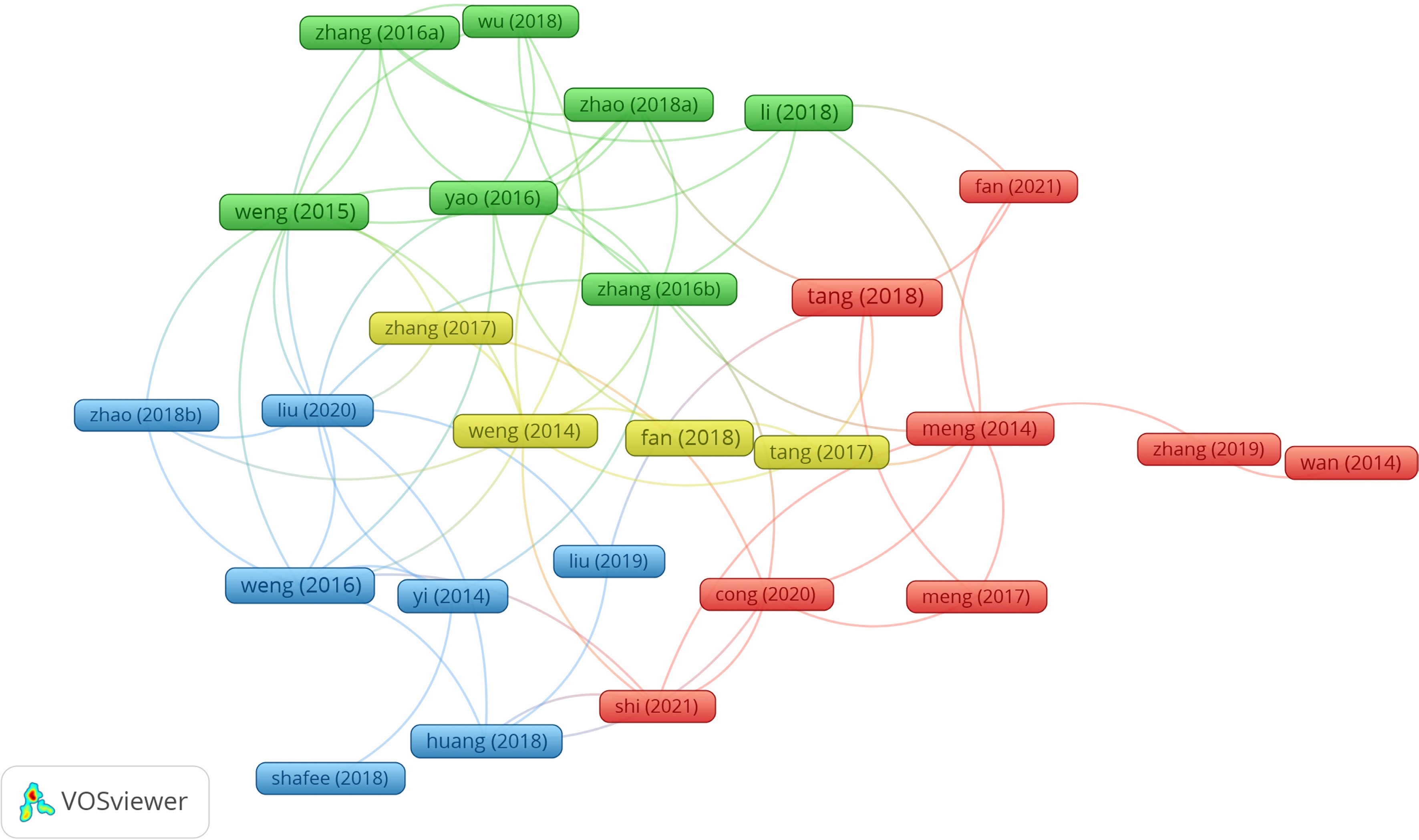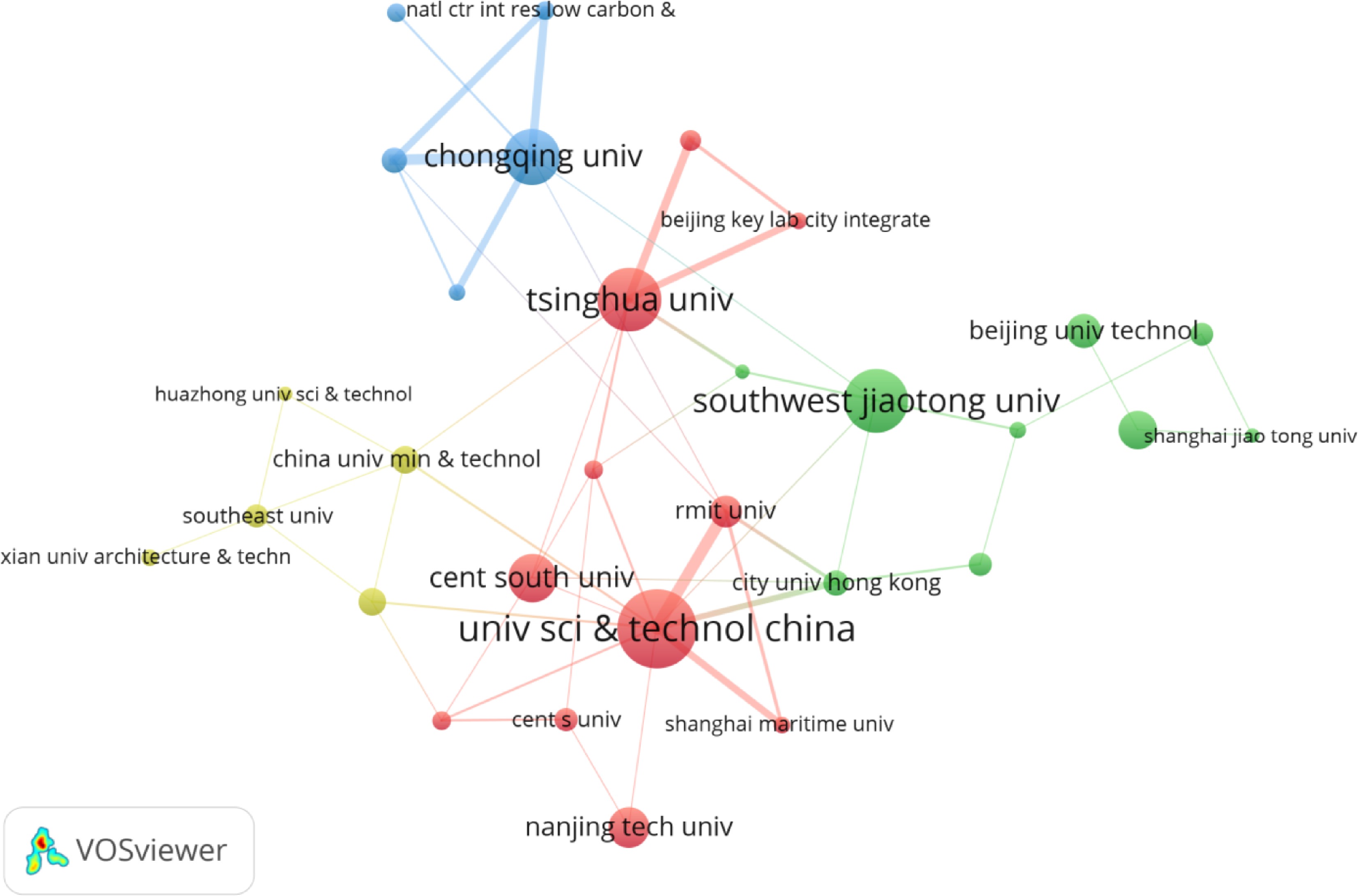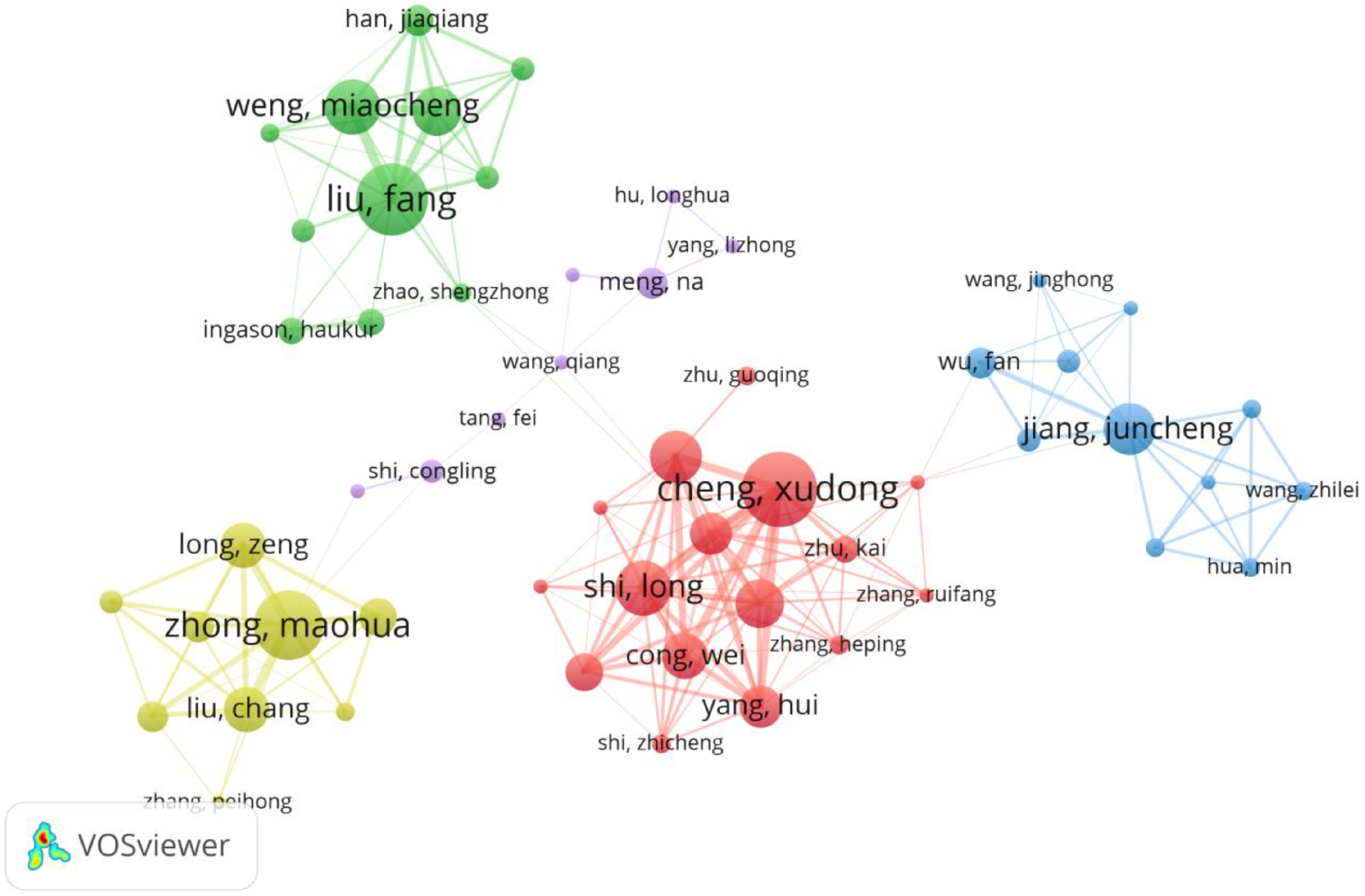 • Using VOSviewer to analyze data exported from WOS, Table 6 lists the top 10 authors who published the most articles, all from China, which showed that Chinese authors made important contributions in the field of subway fires. The remaining 55 authors had a collaborative connection and were naturally portrayed by clustering to create a cooperative network diagram (Fig. 6) of high-volume authors after the authors with fewer than three articles in VOSviewer were eliminated. In Fig. 6, the node represents the author, and the node size represents the number of papers released. The author-author cooperative relationship is represented by the link among nodes, and the degree of collaboration is indicated by the connection's width. Five cooperative clusters were identified in the subway fire research field: red cluster (16 authors), blue cluster (11 authors), green cluster (11 authors), yellow cluster (nine authors), and purple cluster (eight authors). The authors in each cluster were closely linked, and 16 authors in the red cluster were the largest cluster. From Fig. 6, we can see that the clusters of more than 10 authors were: