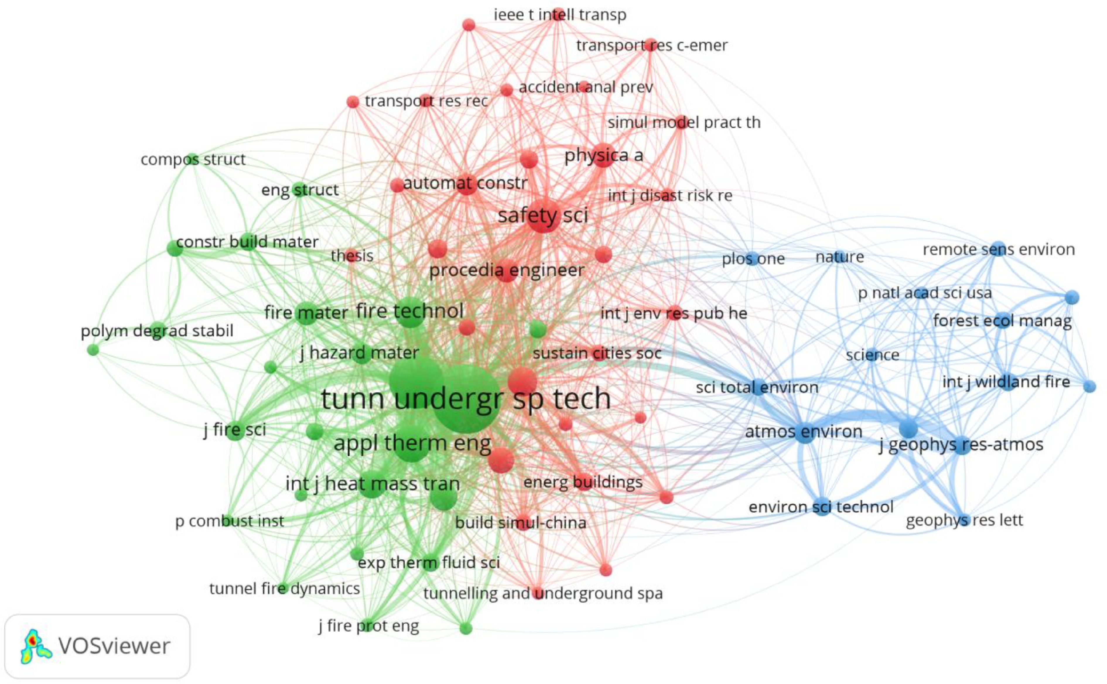Red clustering was a journal of engineering technology and application category based on Safety Science (cited 485 times), Building and Environment (cited 320 times), and Journal of Wind Engineering and Industrial Aerodynamics (cited 246 times). Blue clustering was a journal of environmental science category represented by Atmospheric Environment (171 citations), Atmospheric Chemistry and Physics (127 citations), and Environmental Science & Technology (117 citations). Green clustering was a tunnel and fire safety journal with Tunnelling and Underground Space Technology (cited 2,388 times), Fire Safety Journal (cited 1,392 times), and Applied Thermal Engineering (cited 588 times) as the core. Among them, the number of green clustering citations was the largest, indicating that the early subway fire research was dominated by tunnel fires and underground space fires. After a period of development, the safe operation of the subway was the main research content. Therefore, it can be seen in Fig. 8 that most of the red clustering journals were based on safety science and ventilation engineering, and were also the most closely related to other clustering journals. In the stage of stable development, as people paid increasing attention to environmental safety, the number of journals in the category of environmental protection has gradually increased, but the current blue clustering has not formed a strong correlation. Core journals in the field of subway fire research in the future will likely change from traditional construction engineering journals to environmental materials journals.