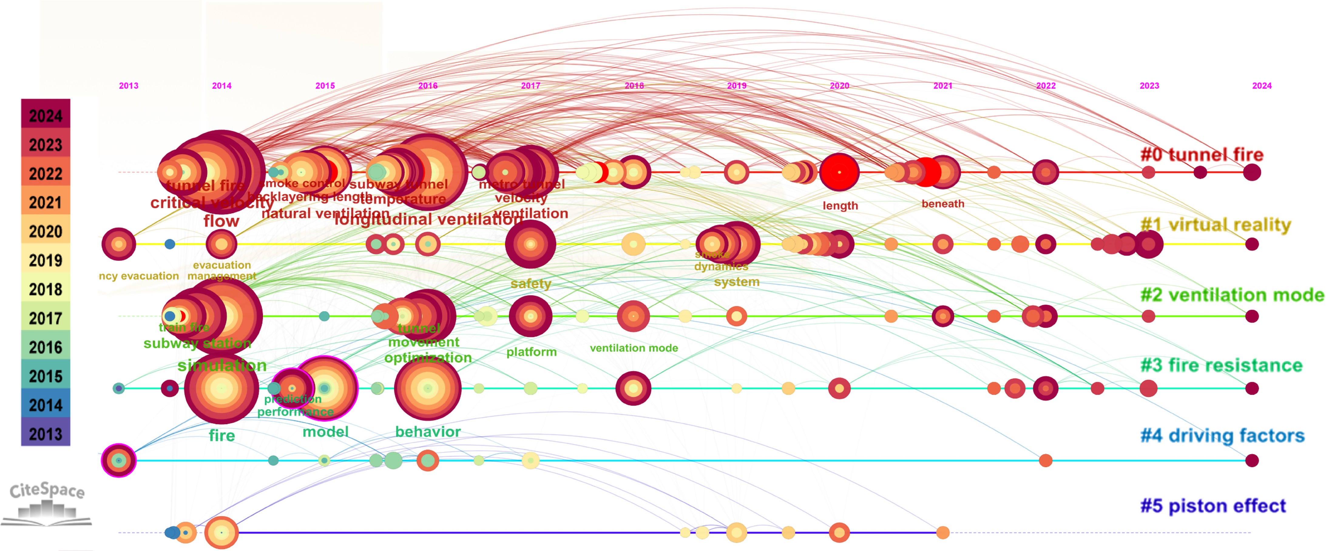 Figure 9 shows that there were three phases to the average appearance period for keywords in the subway fire research sector. The first phase was the initial phase from 2013 to 2015. This stage took 'simulation', 'fire', 'tunnel fire', and 'flow' as the main research keywords. It served as the foundation for subsequent studies and was the initial phase of subway fire research. The second phase was the subway fire field's slow ascent between 2015 and 2019. The keywords related to fire scene such as 'smoke', 'longitudinal ventilation', 'natural ventilation', and 'blockage ratio' emerged as the research direction, which reflected the rise of longitudinal ventilation and mechanical ventilation in subway fire research. The total citation frequency of keywords was low since their average period of appearance was a little late. Designing hybrid ventilation systems that could handle several challenges at once became more crucial as tunnels grew longer and more intricate. The third phase was the emerging development stage. From 2019 to 2024, keywords such as 'length', 'smoke movement', 'emergency ventilation', 'flame retardancy', 'crowd evacuation', 'virtual reality', and 'air quality' appeared in the field of subway fire. In the studies of subway fire avoidance and management, researchers paid attention to optimizing the experimental conditions to achieve the optimal solution. The third stage carried out extensive research on emergency ventilation, smoke diffusion, and fire prevention effectiveness based on earlier subway fire studies. Improving the materials used in tunnel construction and vehicles, as well as fire extinguishing systems, will continue to be crucial given the continual rise in the scale and complexity of subway systems. More thorough study in the future will concentrate on developing fire detecting technologies that facilitate early warning and on novel fire protection coatings and materials that can tolerate extended high temperatures. Additionally, passenger behaviors during fires and emergency evacuations will receive more scrutiny. The research emphasis is likely to shift toward optimizing evacuation procedures and analyzing human behavior in fire scenarios. The trend in evacuation-related keywords has been further influenced by the emergence of social force models and virtual reality (VR) in evacuation simulation, emphasizing multidisciplinary approaches that combine the social sciences and engineering. Related keywords have emerged in the area of subway fire research in recent years as a result of growing awareness of environmental safety and climate change. The research focus has also shifted toward understanding how climate change may affect temperature and humidity conditions, fire behavior, and evacuation time in subway tunnels, as a result of the effects of extreme weather events and changing environmental conditions on the underground environment of subway systems, as well as on the design of ventilation and fire safety systems.