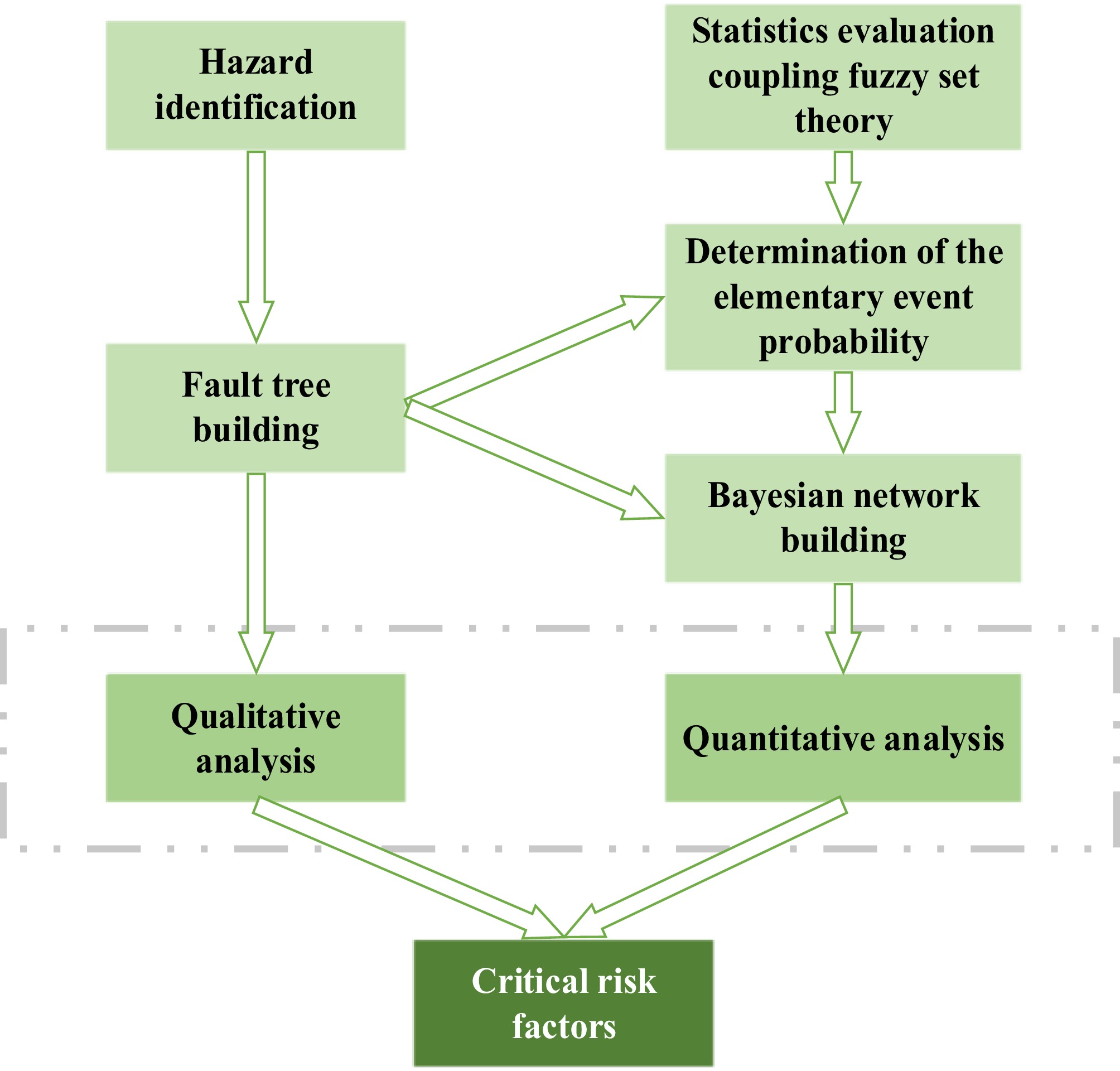 Implementing practical risk assessments for hazardous chemical road transport can mitigate accident occurrence and severity. Risk assessment encompasses both qualitative and quantitative analyses. Scholars have employed qualitative methods—including checklists, Preliminary Hazard Analysis (PHA), and Fault Tree Analysis (FTA)—to identify and classify risks across diverse hazardous chemical transportation accidents. For instance, Faghri & Egyhaziova[1] applied fault trees to evaluate sensor reliability in intelligent highway systems. Rajeshwar Rao et al.[2] proposed a chemical-specific risk index method to establish scientific risk stratification. Fabiano et al.[3] developed an accident frequency assessment model using field data from an Italian pilot highway and multivariate statistical analysis. Oggero et al.[4] employed descriptive statistics to analyze common causes and hazards of hazardous chemical transport accidents. Shen et al.[5] based on the analysis of 708 hazardous goods accidents in China (2004–2011), reported high leakage probabilities and fire/explosion risks. Sarvestani et al.[6] used fault tree identifying management/organizational shortcomings and design errors as primary contributors, and domino effects occurring in a majority of cases. Chang et al.[7] used the fault tree-hierarchical analysis method (FTA-AHP) to conduct a quantitative analysis of the main causes of fires and explosions in hazardous chemical storage areas at ports and found that human factors were the direct cause. In quantitative analysis, Ona et al.[8] constructed a Bayesian network (BN) model to classify injury severity using rural highway accident data. Zhao et al.[9] utilized Bayesian networks (BNs) to identify the three highest-priority causal events in hazardous chemical transport accidents. Zhu et al.[10] constructed an accident causal chain using a Bow-tie model, and converted it into a Bayesian network, and calculated the probability of rollover/skidding at different wind speeds as conditional probabilities. Wang et al.[11] integrated Bow-tie diagrams with BN to dynamically model multi-hazard chains in hazardous chemical transport, leveraging real-time sensor data.