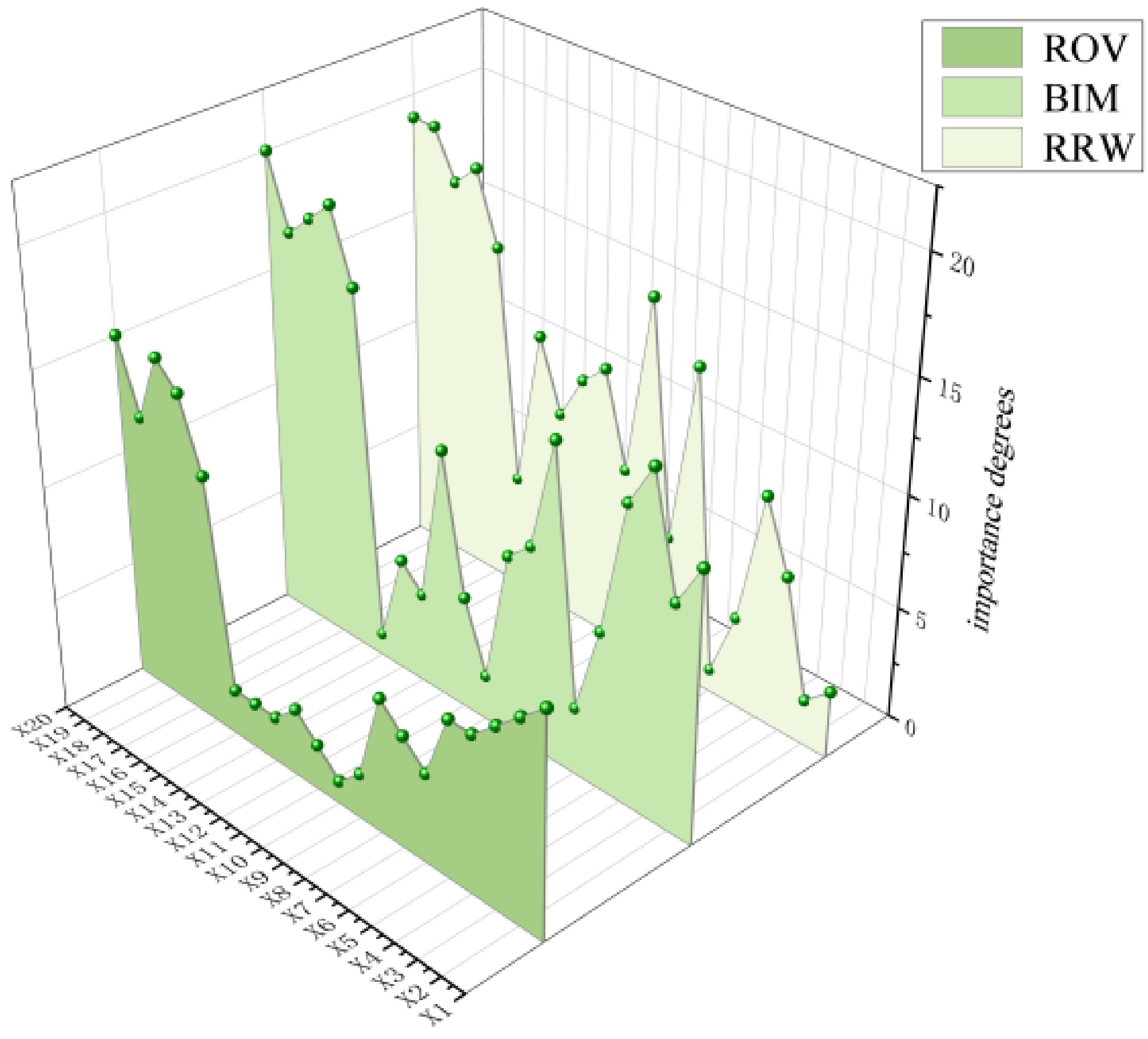 • Since the structural importance ranking derived from the qualitative analysis of the fault tree is more significantly influenced by the fault tree structure and less accurate compared to quantitative Bayesian network analysis, this study comprehensively analyzes and compares three metrics: ROV, BIM, and RRW. The ranking comparison of all root node metrics is shown in Fig. 10.