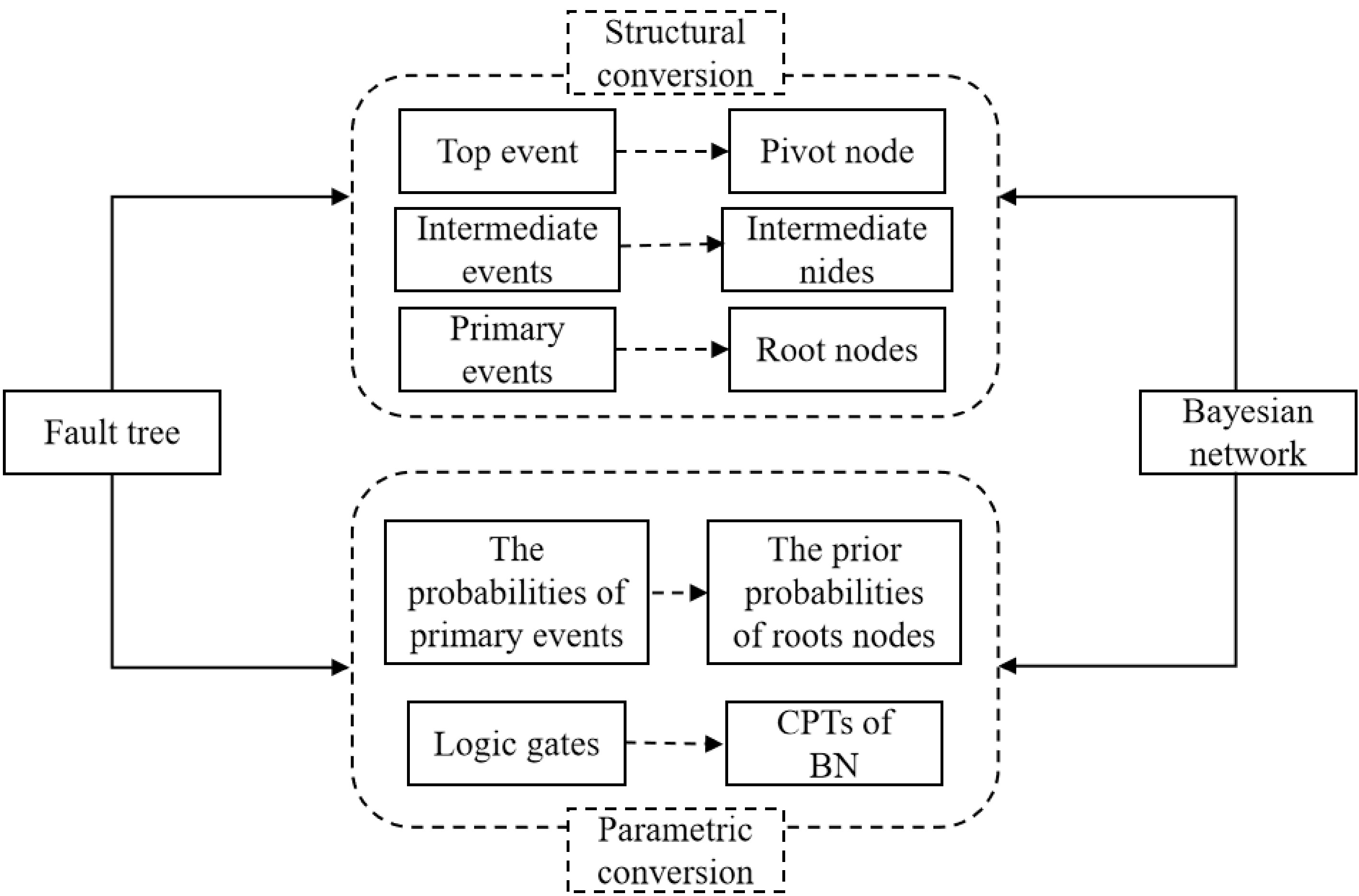 To address these limitations, this study implements an integrated FT-BN framework for causal analysis. To overcome the above shortcomings, this study uses a fault tree and Bayesian network fusion method for causal analysis, solving problems such as the high data dependency and complex computational reasoning of ordinary fault trees and Bayesian analysis. The specific conversion process is shown in Fig. 2.