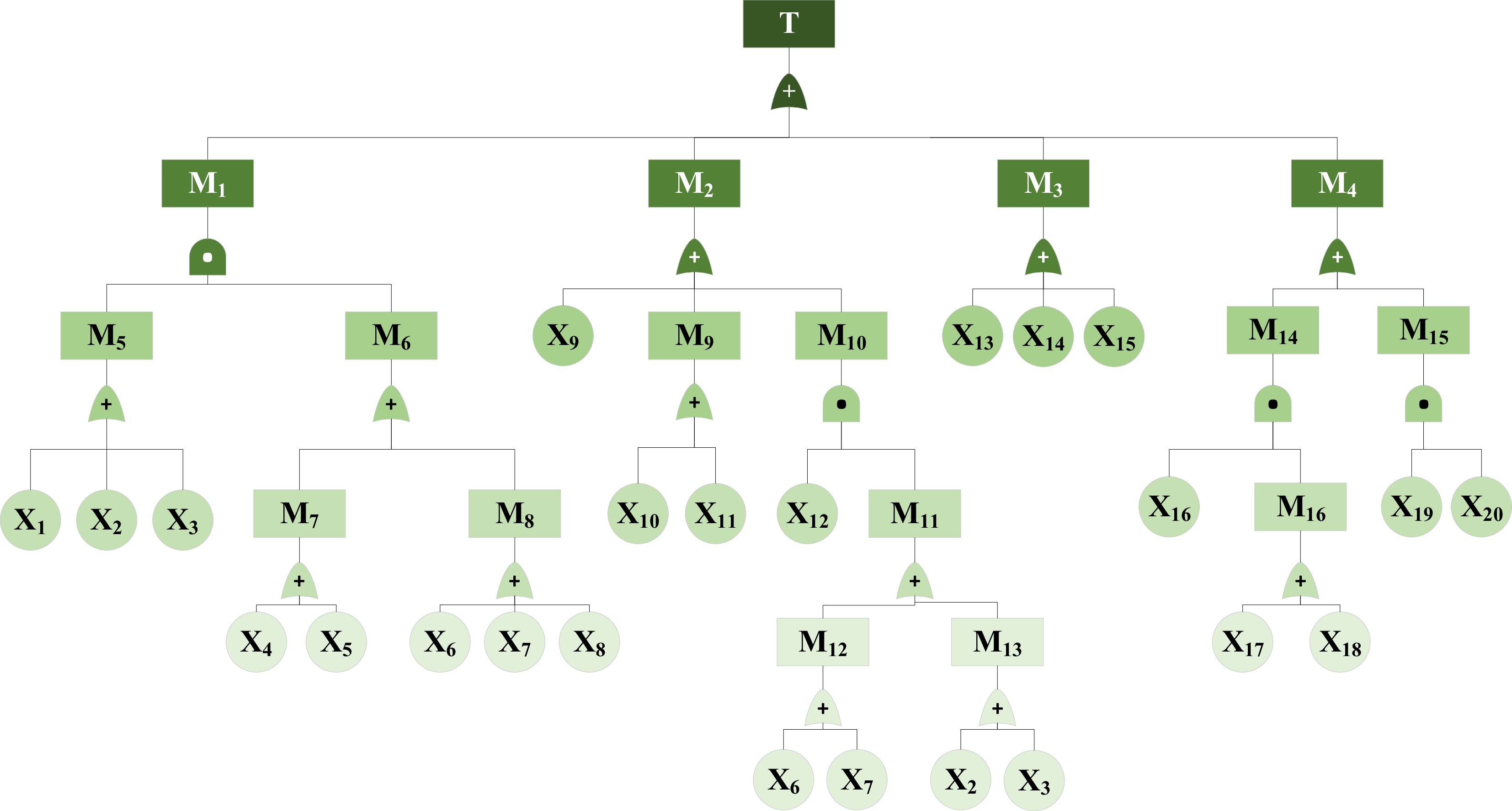 The fault tree comprises 21 second-order and seven first-order cut sets. The structural importance ranking of basic events X1−X20 derived from minimal cut sets is: