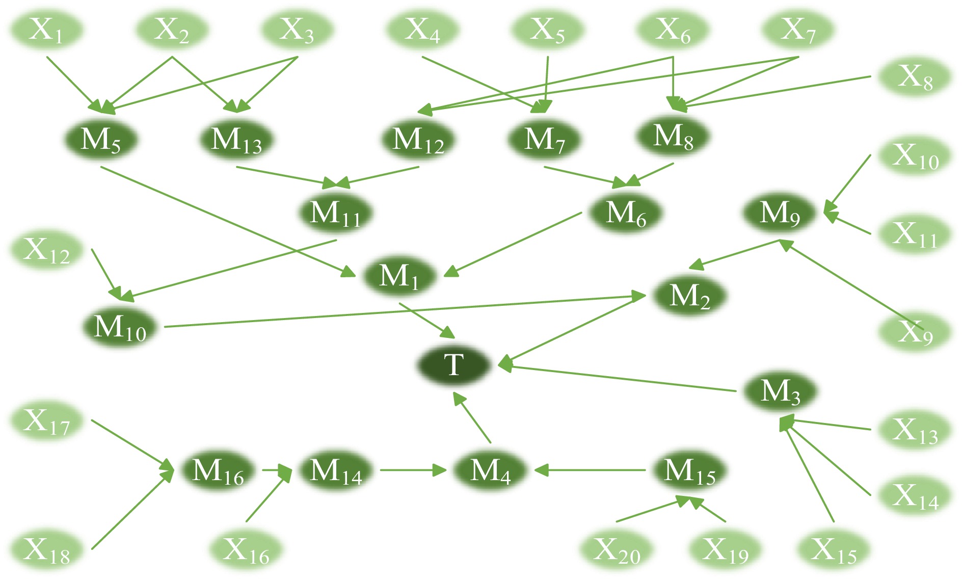 where, ${I_{RO}}({X_i})$ represents ROV for root node ${X_i}$; $P({X_i} = yes)$ denotes the occurrence probability of ${X_i}$; $ P({X}_{i}=yes\text{|}T\text{=yes}) $ signifies the posterior probability of ${X_i}$ given leaf node $T$ occurs.