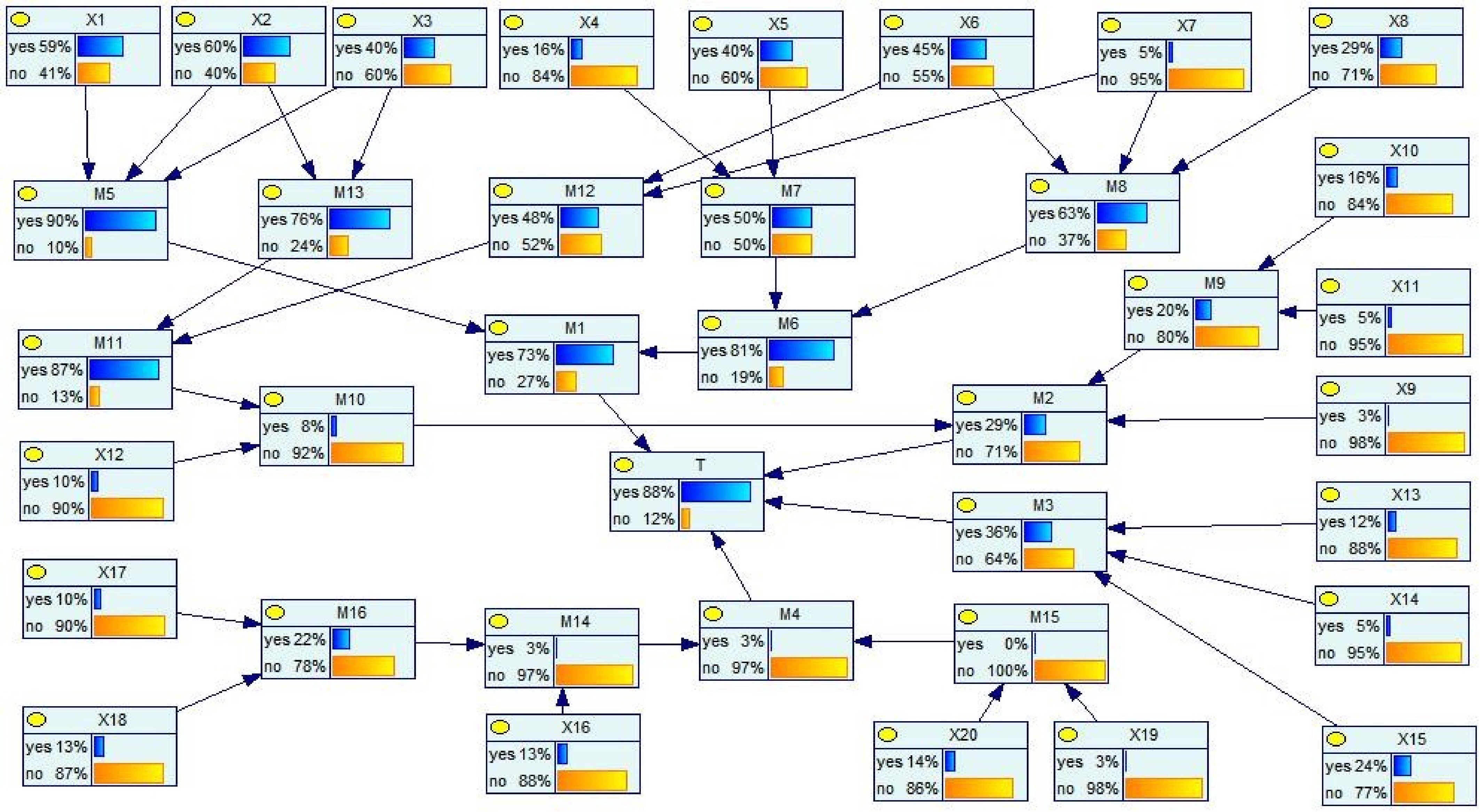 • Utilizing the constructed LNG road transport tanker rollover fault tree model and the transformation method in Fig. 2, the Bayesian network for LNG tanker rollovers was developed employing GeNIe, as presented in Fig. 4. The prior probabilities for the 20 root nodes correspond to the defuzzified values in Table 5. Unlike the determination of probability distributions for root nodes, non-root nodes require the specification of conditional probabilities. Using intermediate nodes M15 and M9 as representative examples of 'AND' and 'OR' logic, respectively, Tables 6 and 7 show examples of conditional probability representations in the Bayesian network based on fault tree logic gates, defining 'occurrence' as 'yes' and 'non-occurrence' as 'no'.