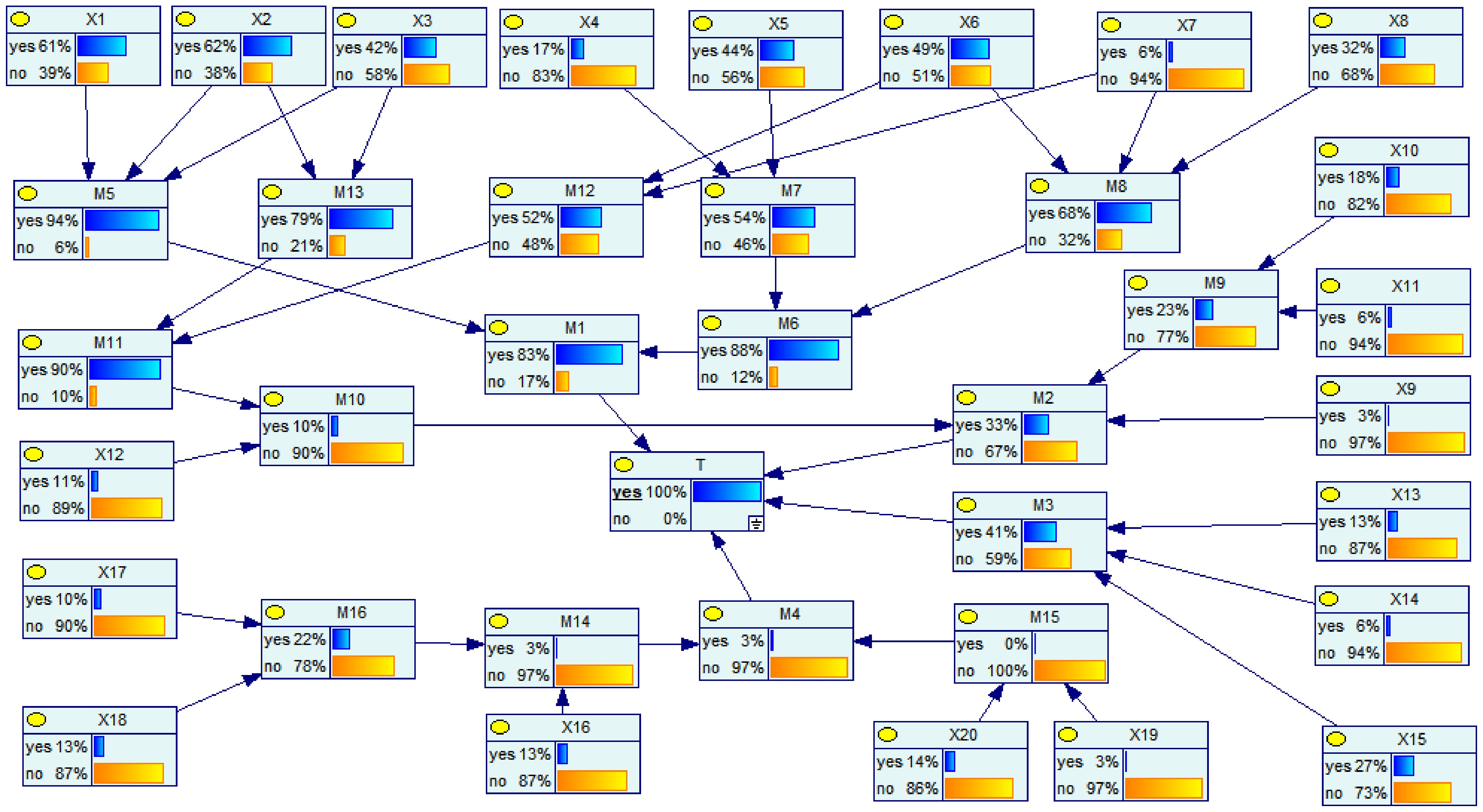 Diagnostic inference of the BN with 100% probability of the leaf node.