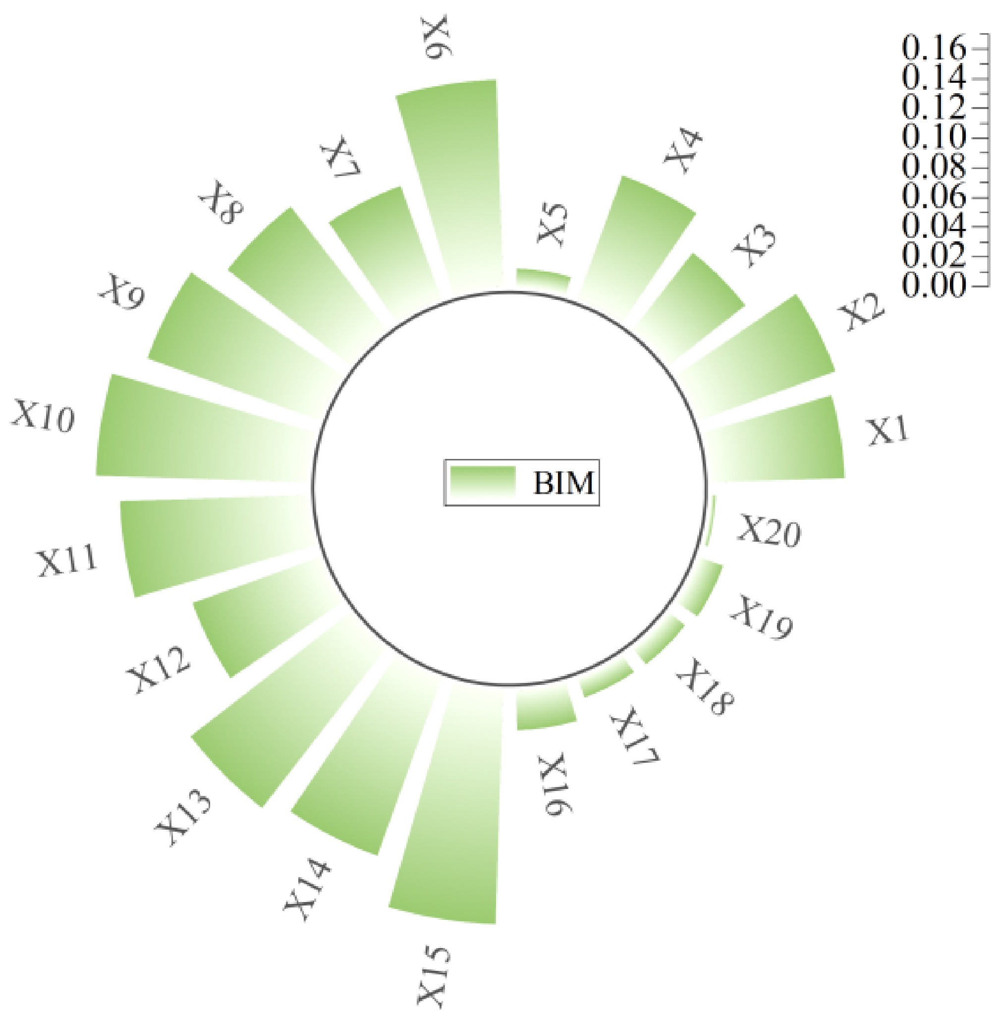 $\begin{split}\rm I(X_{ 15} )=\;&\rm I(X_{ 14} =I(X_{ 13} )=I(X_{ 11} )=I(X_{ 10} )=I(X_{9} ) \gt I(X_{3} )=I(X_{2} )\\& \rm \gt I(X_{1}) \gt I(X_{16} )=I(X_{12} ) \gt I(X_{20} )=I(X_{19} ) \gt I(X_{7} )=I(X_{6} )\\&\rm \gt I(X_{18} )=I(X_{17}) \gt I(X_{8} )=I(X_{5} )=I(X_{4} )\end{split} $
