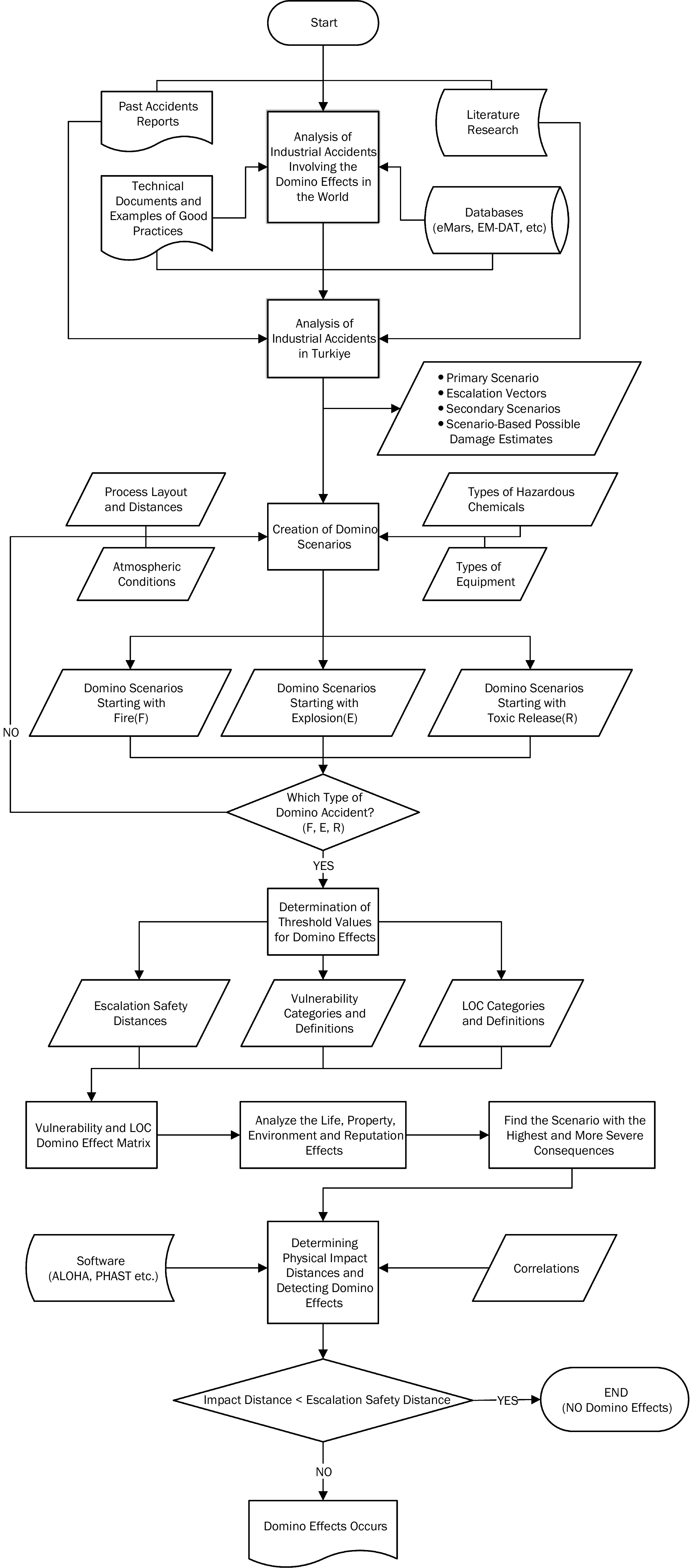 The process begins with an analysis of accidents involving domino effects, first globally, and then in Turkiye, using various data sources. Domino scenarios are created using process information and atmospheric selections. After determining the type of domino accident, thresholds for domino effects are determined. The domino scenario that will produce the most serious consequences is selected, physical impact distances are determined, and these distances are compared with safety distances. It is determined that if the impact distance is greater than the safety distance, a domino accident will occur deterministically. Details of each stage of the process are explained in the following sections.