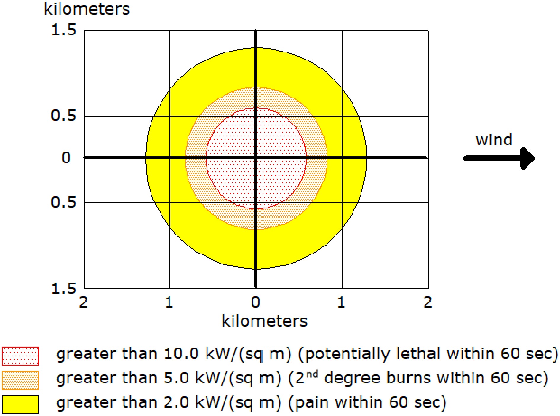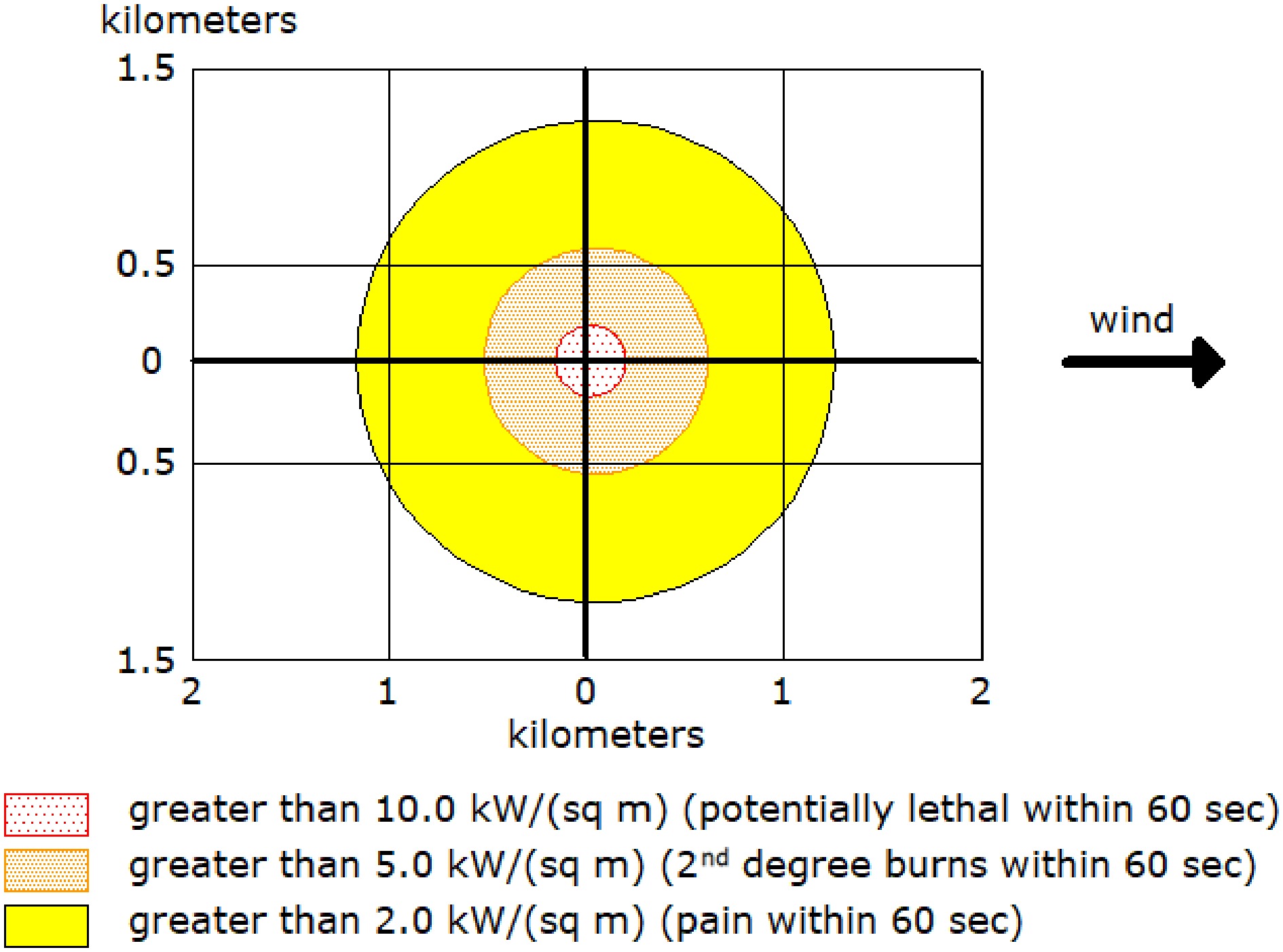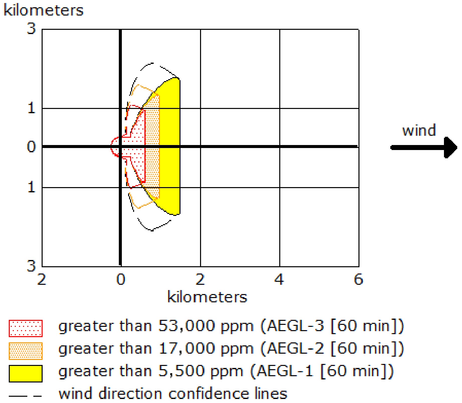 According to toxic hazard distances, for a 60-min spread, lethal effects are at 613 m at 53,000 ppm; poisoning effects are at 978 m at 17,000 ppm; and painful effects are at 1,500 m at 5,500 ppm. ALOHA determines the area where the chemical concentration may exceed the specified exposure limit and constitute a threat zone after a certain period after the release of the chemical. The difference between the exposure levels is the exposure times. AEGLs are defined for periods of 10 min, 30 min, 60 min, 4 h, and 8 h. Although AEGLs have been developed for a variety of exposure times, ALOHA only includes 60-min AEGLs[12]. AEGL-3 represents the airborne concentration at which the general population may experience life-threatening health effects or death. AEGL-2 is the airborne concentration at which the general population may experience other serious, irreversible, long-term adverse health effects or impairment of escape ability. AEGL-1 is the concentration in air at which the general population may experience significant discomfort, irritation, or specific asymptomatic nonsensory effects. The effects are non-disabling and transient, reversible upon cessation of exposure.