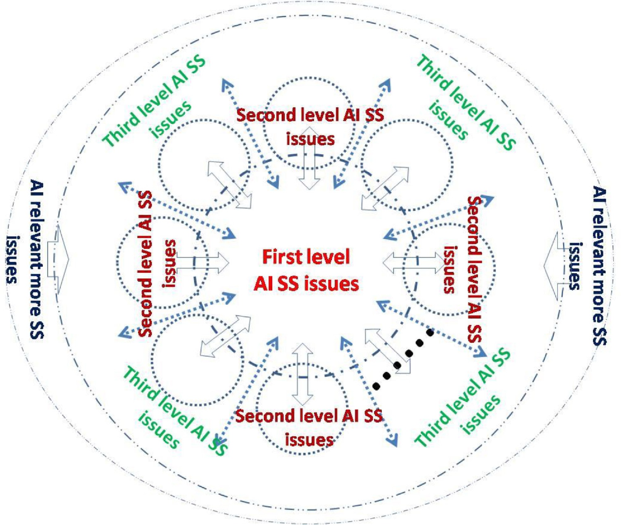 Obviously, in the time dimension, the first category of AI SS problems in the above three levels appeared first, followed by the second and third categories. The three categories of SS problems are not completely progressive in the time dimension. In practice, the three categories of AI SS problems are interrelated and interactive, and have some degree of intersection. With the application of AI in various SS fields from trial to maturity, the three categories of AI SS issues can also form a spiral upward trend and mode. The three-level and three-category problems of AI and SS and their interrelationships are shown in Fig. 2.