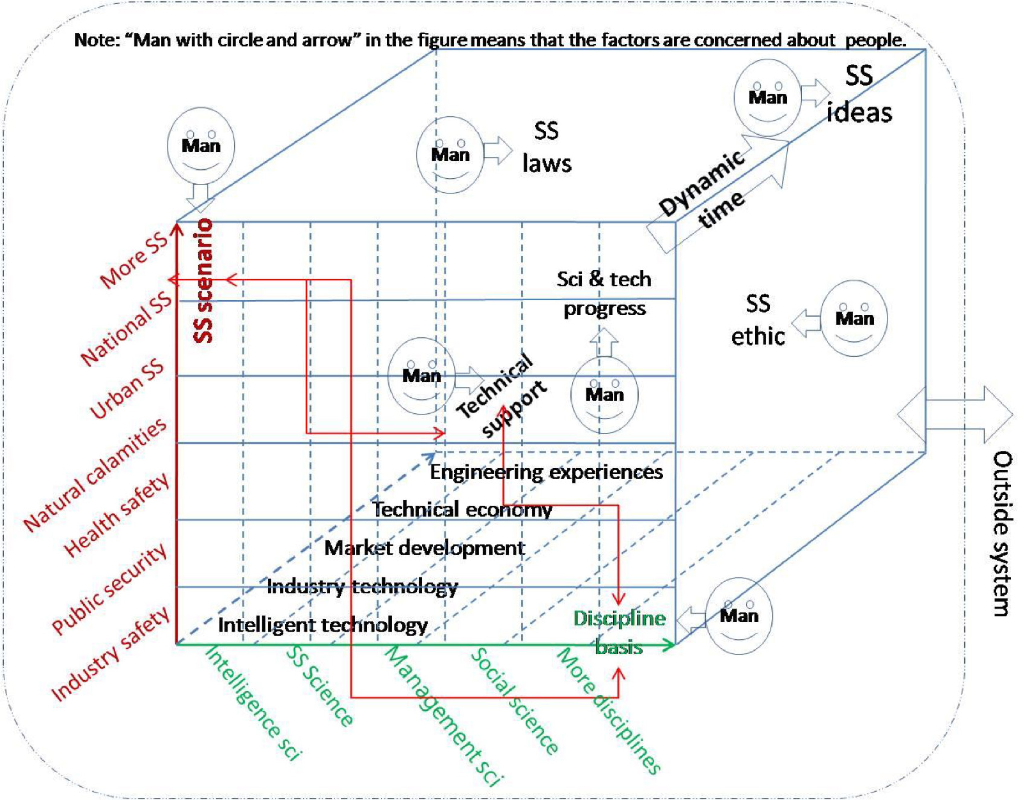 It can also be seen from Fig. 3 that the components and elements of the above four dimensions are interrelated and affect each other, forming a dynamic operating system. Each component and element of the system are related to human factors, subject to SS laws and regulations and ethics, and constantly produce dynamic exchange of input and output with external systems. In addition, in the current stage when human beings can play a leading role in intelligent systems, it is critical that forward-looking advanced SS concepts lead the design of all components and elements of intelligent systems, and the operation of the system.