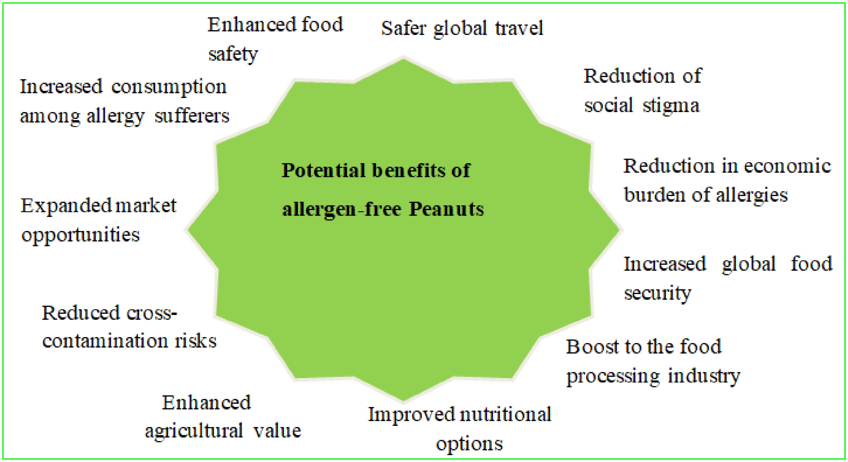 • Allergen-free peanuts could have a significant public health impact by reducing the prevalence of peanut-related allergic reactions, including life-threatening anaphylaxis. A study on the risks of shared equipment in restaurants for individuals with peanut allergies, specifically in the context of preparing Asian dishes, concludes that an eliciting dose of 300 or 1,000 mg of peanut protein is clinically significant for the peanut-allergic population[77]. This innovation could greatly reduce the need for strict avoidance measures and emergency treatments for individuals with peanut allergies, improving their overall quality of life and potentially reducing the occurrence of allergies in future generations. The introduction of allergen-free peanuts may also support the growth of peanut-based products and open new market opportunities. A book chapter on the economic and academic significance of peanuts highlights the strong global demand for peanuts and peanut-based products, particularly in the confectionery sector[6]. Reducing concerns about allergic reactions would enable food manufacturers to include peanuts in a wider variety of products, unlocking new opportunities in the food industry[78]. Educational institutions, airlines, and other organizations could also safely reintroduce peanuts into their offerings, capitalizing on the peanut's versatility and nutritional value. The American Sociological Review article Another Person’s Peril: Peanut Allergy, Risk Perceptions, and Responsible Sociality suggests that the three dimensions of proximity to risk material, social, and situational play a key role in shaping policy discussions and influencing how people perceive fear, trust, rights, obligations, and freedom in shared environments, ultimately guiding their views on 'responsible sociality'[79]. Crucially, allergen-free peanuts would preserve their nutritional integrity, providing a sustainable source of protein, healthy fats, and essential nutrients. Research on the bioactive compounds in peanut skin for chronic non-communicable diseases highlights that, due to its polyphenolic content 60 to 120 times higher than that of the peanut grain peanut skin by-products serve as a sustainable source of plant-based bioactives beneficial to human health[80]. Hence, by mitigating allergens without compromising the peanut's nutritional profile, the peanuts could help to address the increasing global food demands while promoting environmental sustainability in peanut cultivation. Creating allergen-free peanuts holds great promise for improving public health, increasing market accessibility, and minimizing the risk of severe allergic reactions, all while fostering a more inclusive food industry (Fig. 3).