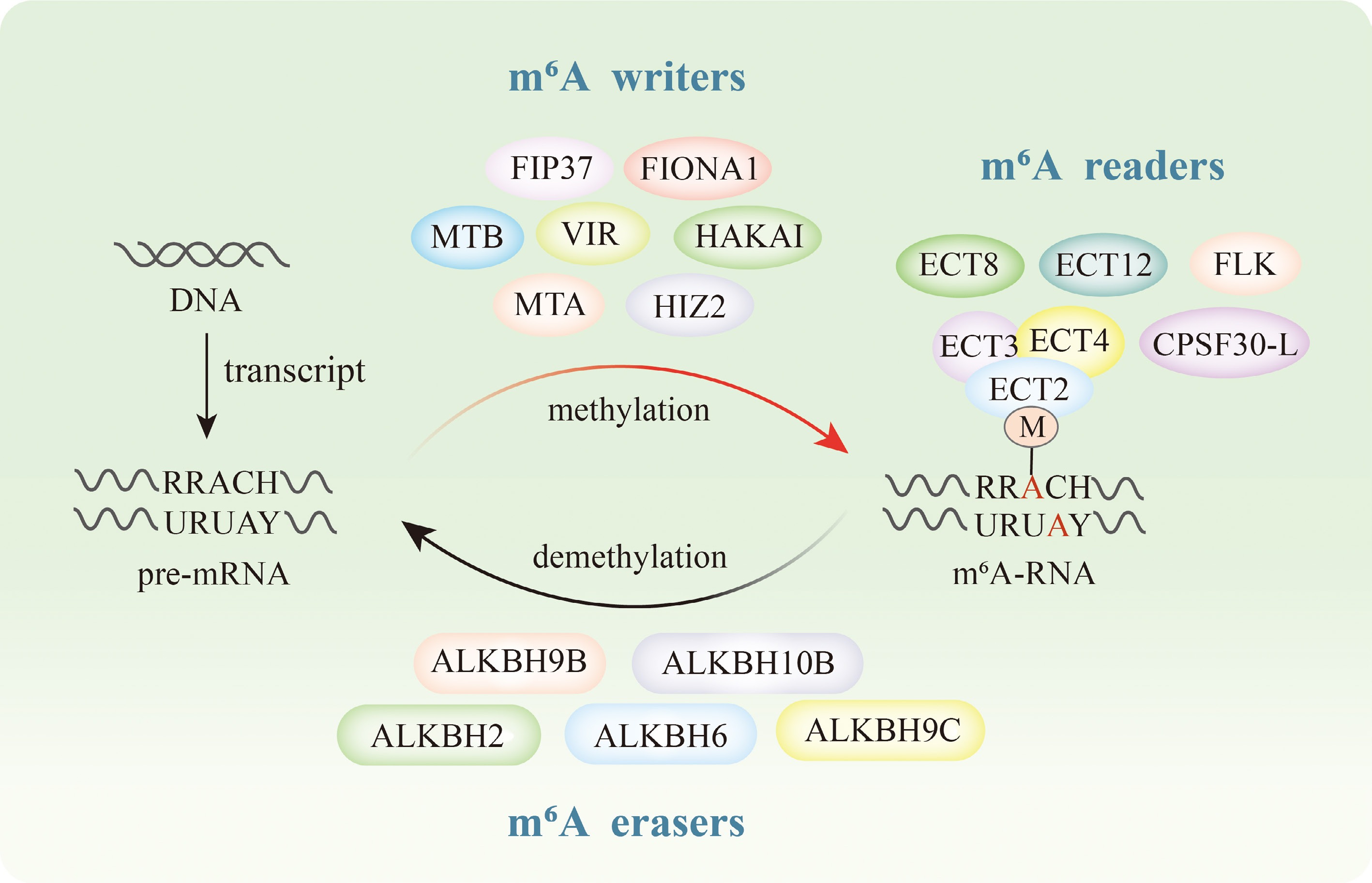 m6A modification related proteins in plants. The writers involved in m6A modification include MTA, MTB, VIR, FIP37, HAKAI, FIONA1, and HIZ2. The readers include ECT2, ECT3, ECT4, ECT8, ECT12, CPSF30-L, and FLK. The erasers include ALKBH2, ALKBH6, ALKBH9B, ALKBH9C, and ALKBH10B.