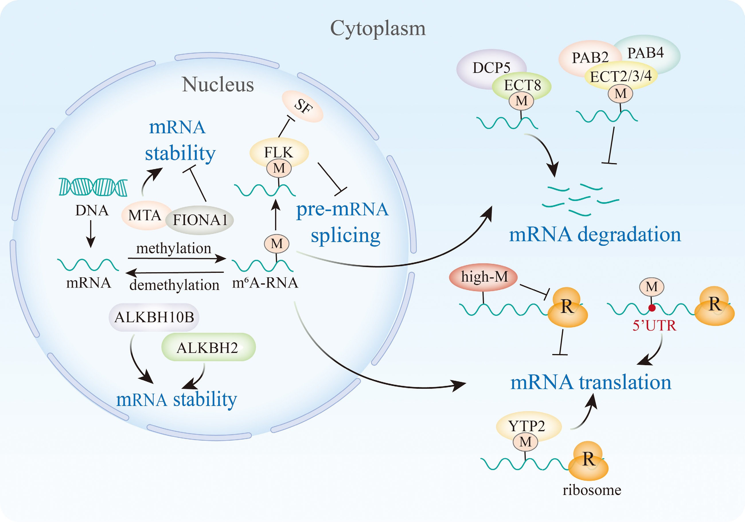 m6A modification affects the mRNA stability, splicing, and translation efficiency. In the nucleus, MTA, ALKBH10B, and ALKBH2 promote the mRNA stability, but FIONA1 inhibits the mRNA stability, and FLK recognizes the m6A and inhibits the interaction with SF, thereby inhibiting the pre-mRNA splicing. In cytoplasm, the reader ECT8 recognizes the m6A and interacts with DCP5 to promote the mRNA degradation. And m6A readers ECT2/3/4 redundantly recruit PAB2 and PAB4 to protect the poly(A) tail from deadenylation. In plants, a high level m6A inhibit ribosomes from combining with mRNA, but the m6A sites at 5'UTR and recognized by YTP2 will promote the mRNA translation.