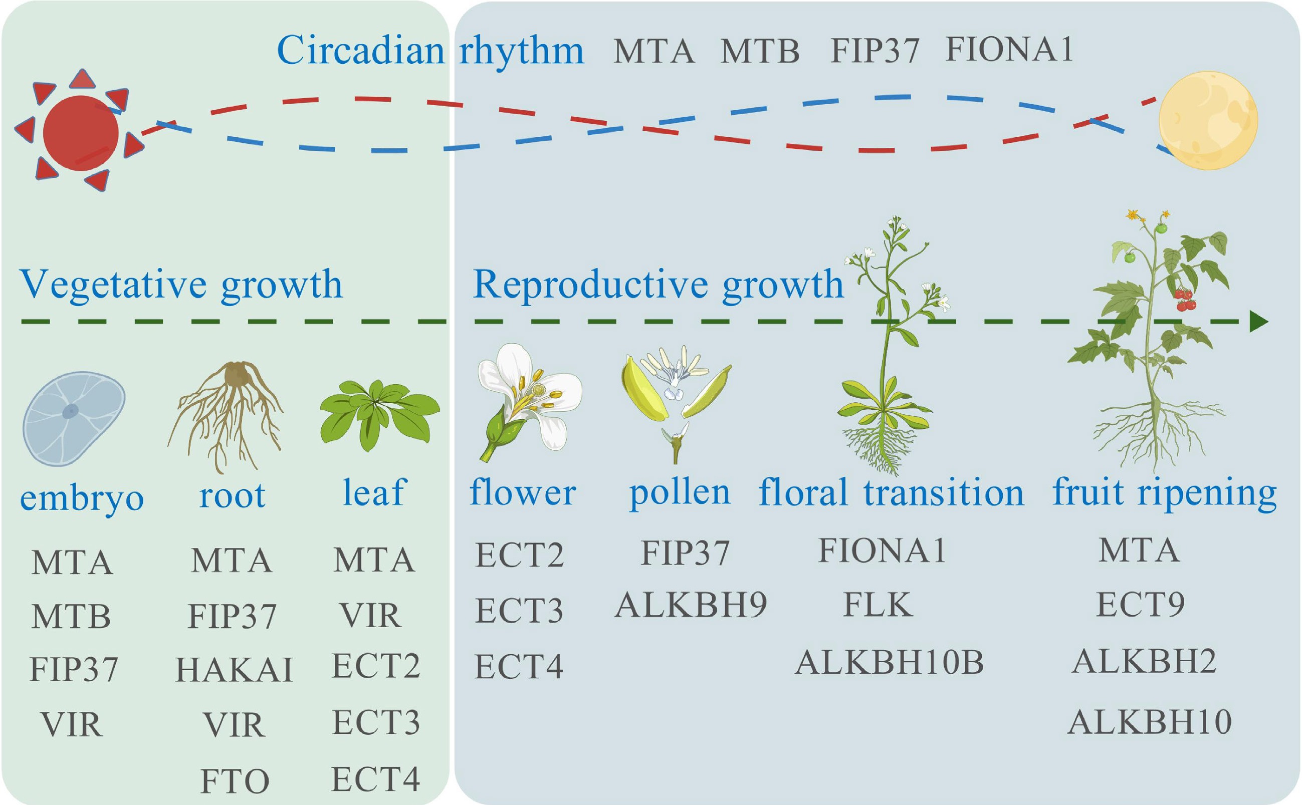 m6A modification affects plant development. During the plant vegetative growth, m6A related proteins affect the embryo, root, and leaf formation. During the reproductive growth, m6A related proteins affect the flower and pollen development, floral transition, and fruit ripening. The plant circadian rhythm is also affected by MTA, MTB, FIP37, and FIONA1.