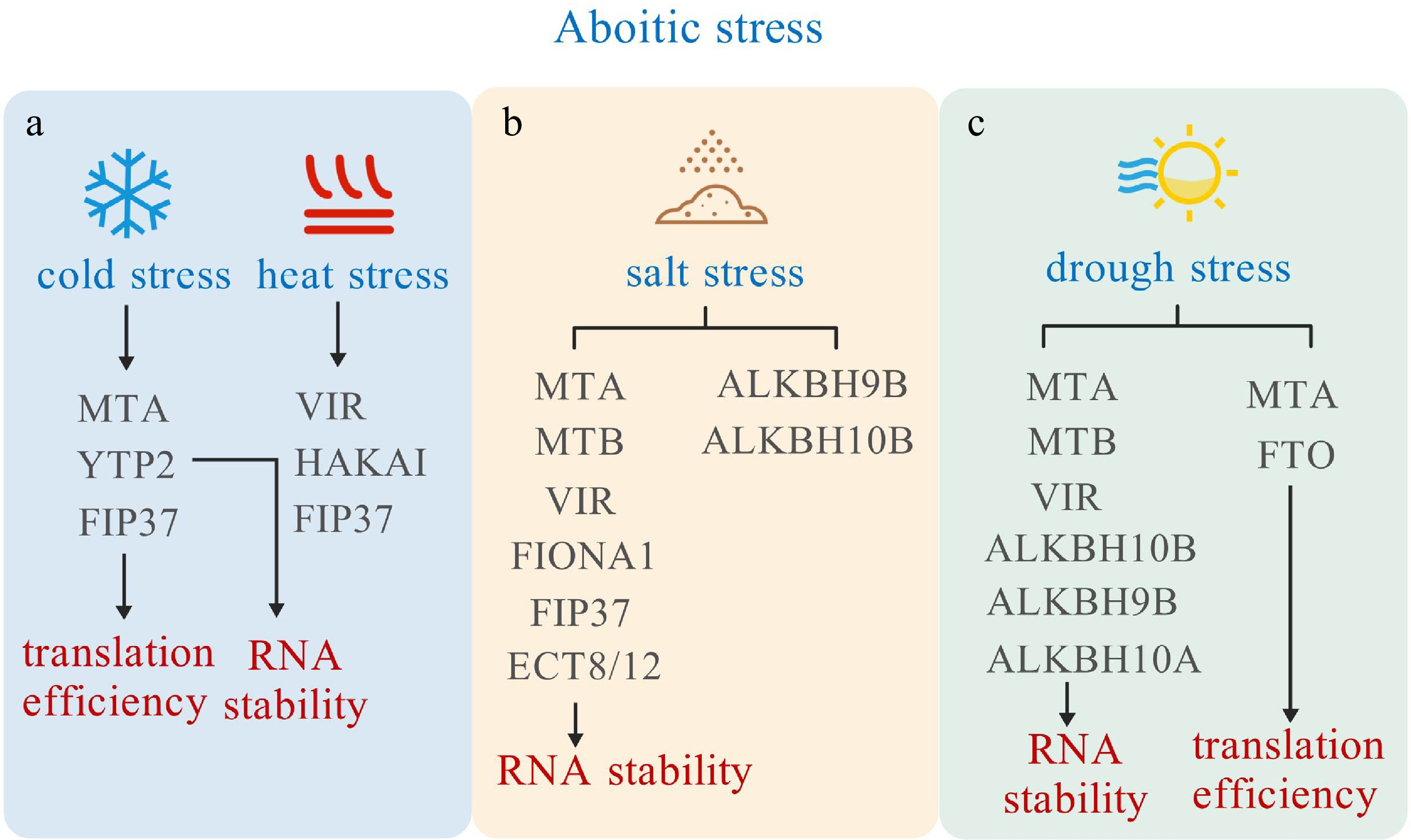 m6A modification role in responding to abiotic stresses. m6A related proteins influence the mRNA stability and translation efficiency, thereby responding to cold, heat, salt, and drought stress.