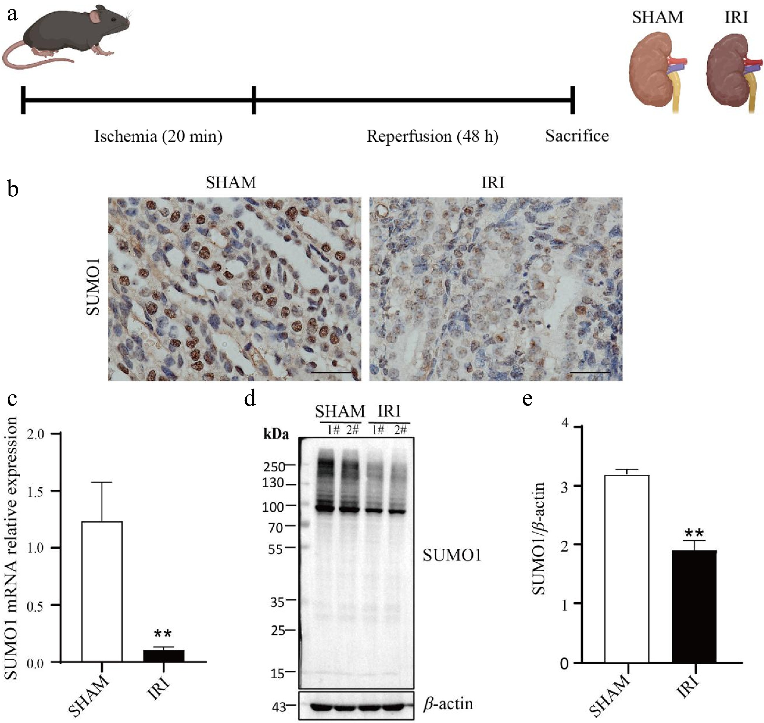 • We first established a renal IRI model in P7 mice (Fig. 1a). IHC analysis revealed significantly reduced SUMO1 expression in renal tissues of IRI model mice vs sham controls (Fig. 1b). To further confirm the changes of SUMO1 expression under the IRI model, we then conducted real-time PCR and western blotting experiments, which showed that both messenger RNA (mRNA, Fig. 1c), and protein levels (Fig. 1d, e) of SUMO1 were found to be reduced in the IRI-treated kidneys compared to the sham controls, which indicated a clear downregulation of SUMO1 expression in the IRI model.