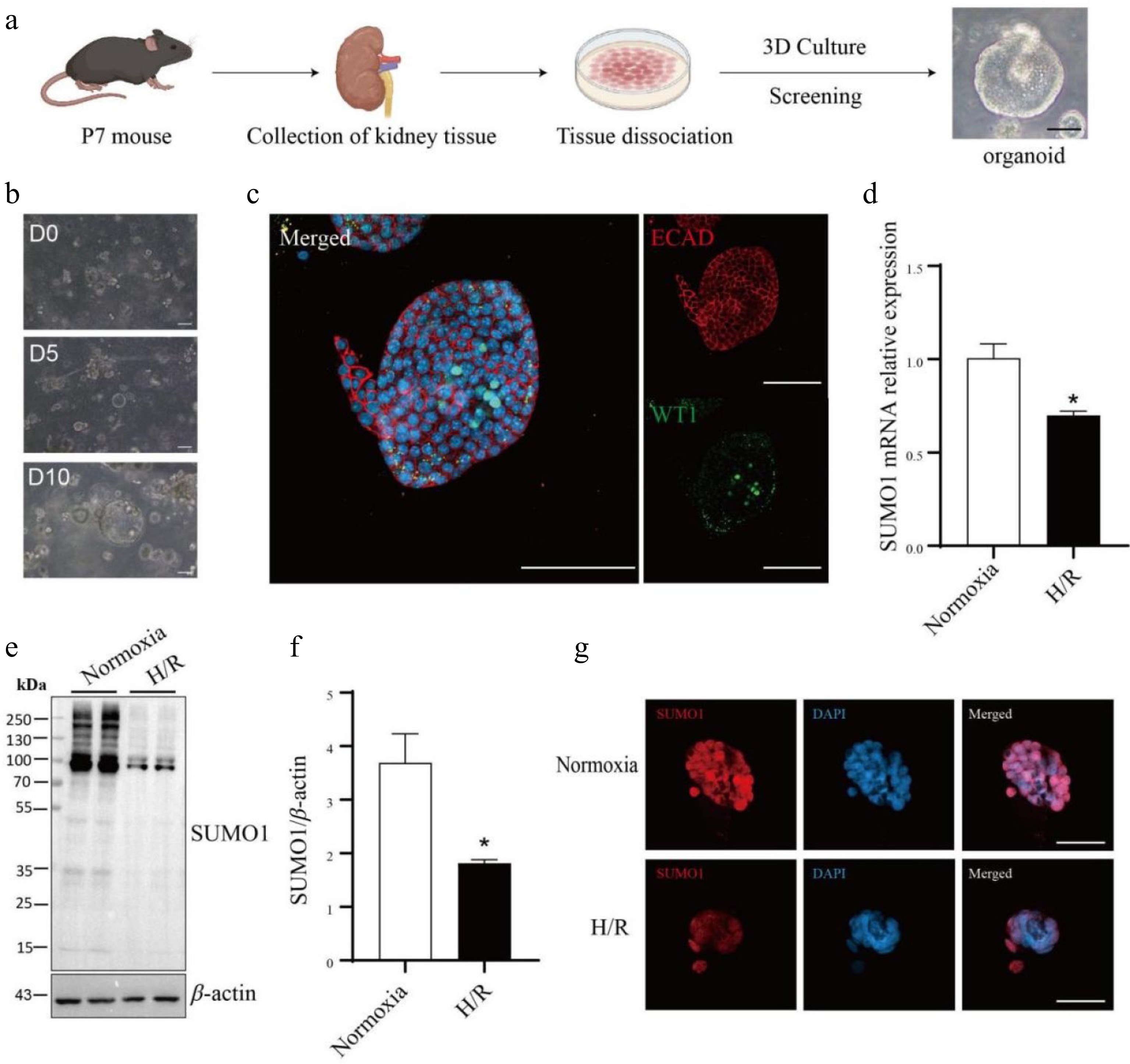 • Then, we initially developed an organoid system from kidney tissues of postnatal day 7 (P7) mice and characterized these kidney organoids in detail. Upon this, we established a kidney organoid model subjected to H/R conditions (Fig. 2ac). Through real-time PCR analyses, we observed a statistically significant downregulation of SUMO1 mRNA expression in the H/R-exposed kidney organoids, in contrast to the sham-treated controls (Fig. 2d). Consistent with these findings, western blotting further confirmed a notable decrease in SUMO1 protein levels within the H/R-treated kidney organoids (Fig. 2e, f). Additionally, IF staining techniques revealed a pronounced downregulation of SUMO1 protein expression in the kidney organoids subjected to H/R conditions (Fig. 2g).