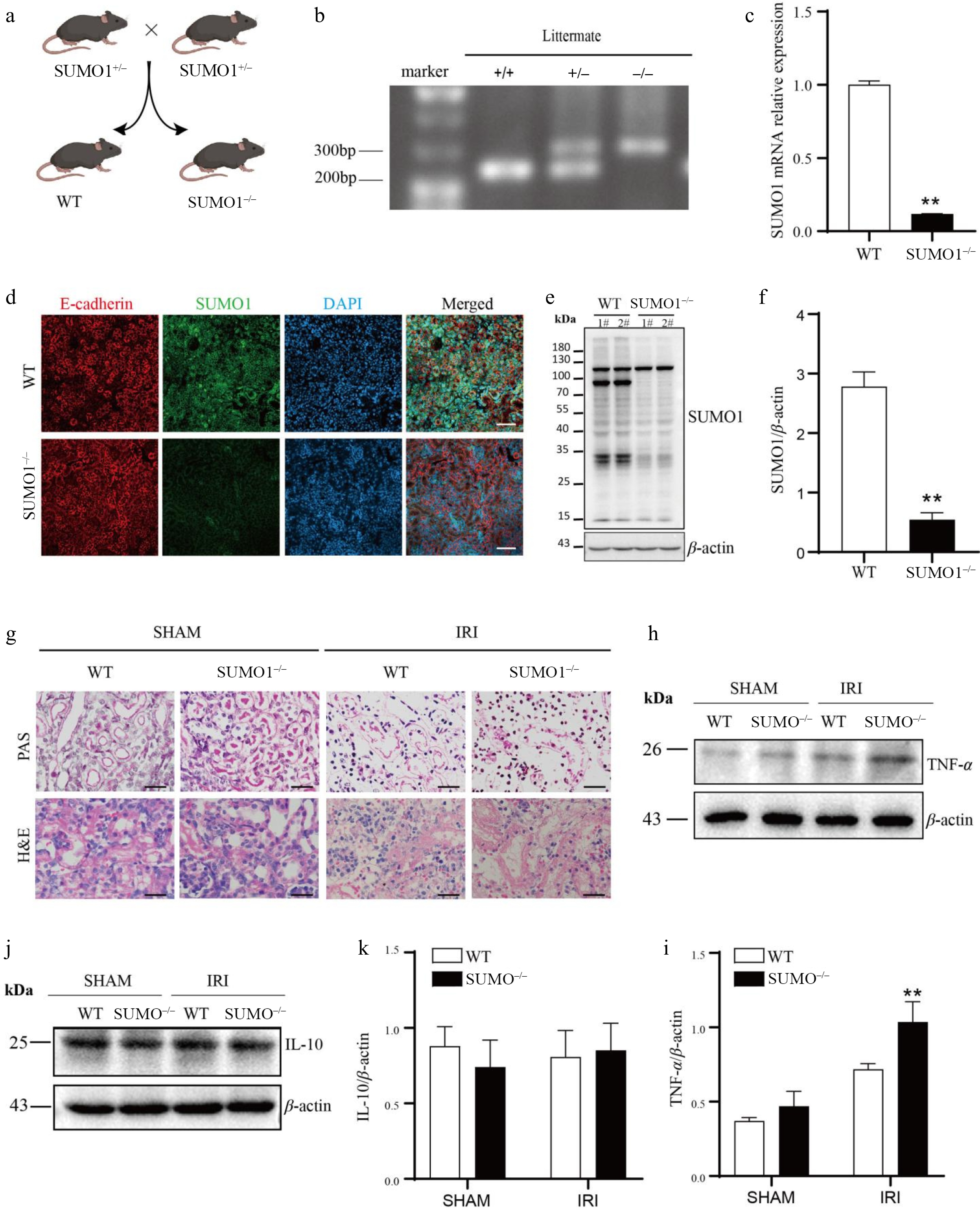 Knocking out SUMO1 worsened IRI-induced AKI. (a) Schematic outline for generating SUMO1 knockout mice. (b) Representative plot of genotyping results. (c) Levels of SUMO1 in kidney were detected by real-time PCR. N = 6. (d) Immunofluorescence analysis of the SUMO1 expression in kidney tissues. Bar = 50 μm. (e), (f) Gray value of SUMO1 signals, normalized to β-actin, to compare the WT and KO group. N = 4. (g) Representative PAS and H&E staining of mouse kidney tissue. Bar = 25 µm. (h), (i) The protein levels of TNF-α in the kidney tissue, with N = 3. (j), (k) The protein levels of IL-10 in the kidney tissue, with N = 3. Data were presented as the means ± SEM. * p < 0.05, ** p < 0.01 when compared to isogenic mice that underwent a sham procedure.