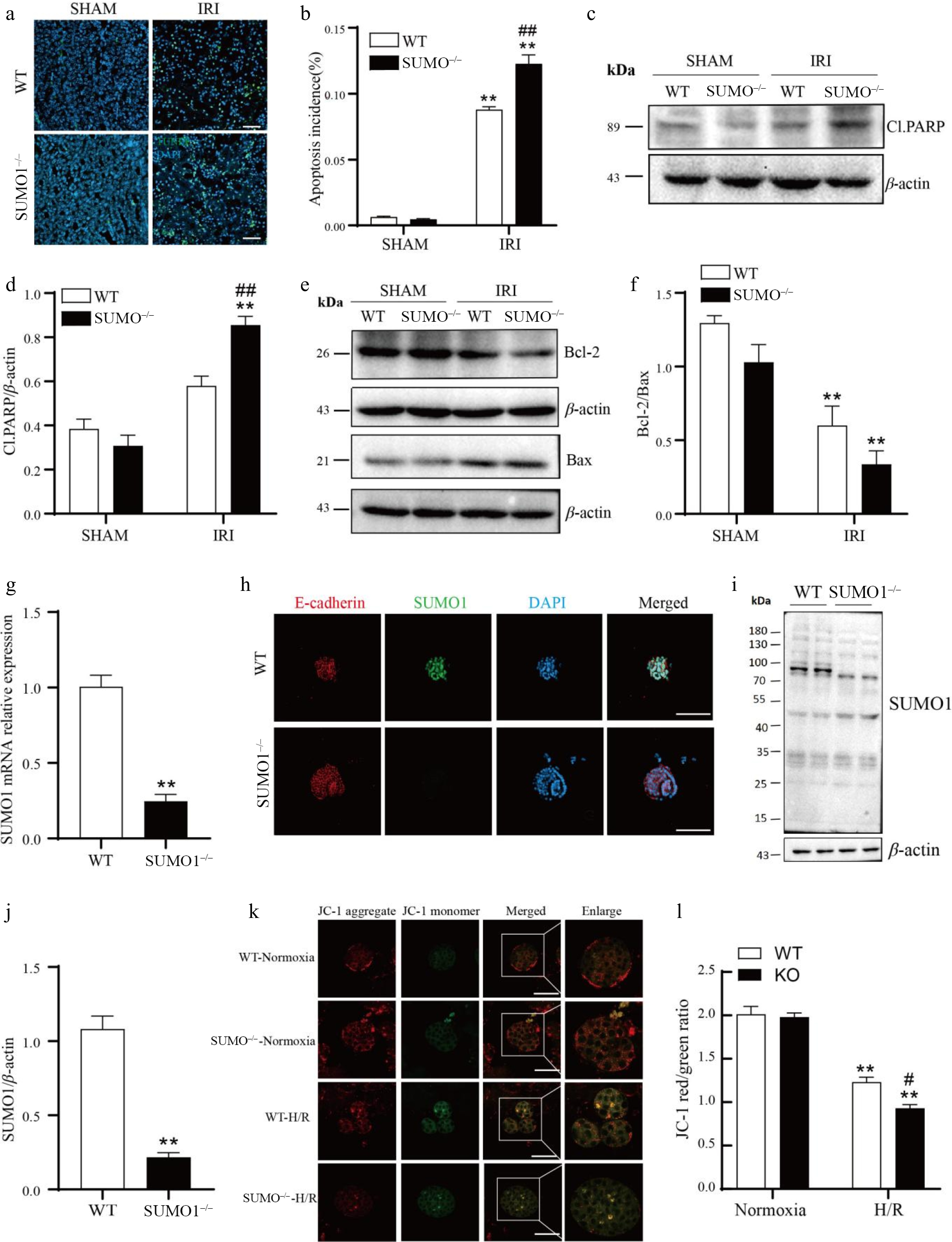 • The above studies found that SUMO1 plays a role in IRI-induced AKI, so what is its potential mechanism of action? Our TUNEL assay demonstrated that IRI induced apoptosis more prominently in SUMO1−/− mice vs WT mice (Fig. 4a, b). To investigate the underlying mechanisms, we performed WB analyses of apoptosis-related proteins. In the sham group, no significant variations were observed between WT and SUMO1−/− mice in the expression of cleaved PARP or in the Bcl-2/Bax ratio, indicating that the deletion of SUMO1 did not significantly affect apoptosis under non-stress conditions. However, in the IRI model, cleaved PARP expression was significantly elevated in SUMO1−/− mice, while the Bcl-2/Bax ratio was reduced, highlighting SUMO1's role in maintaining anti-apoptotic homeostasis during stress (Fig. 4cf).