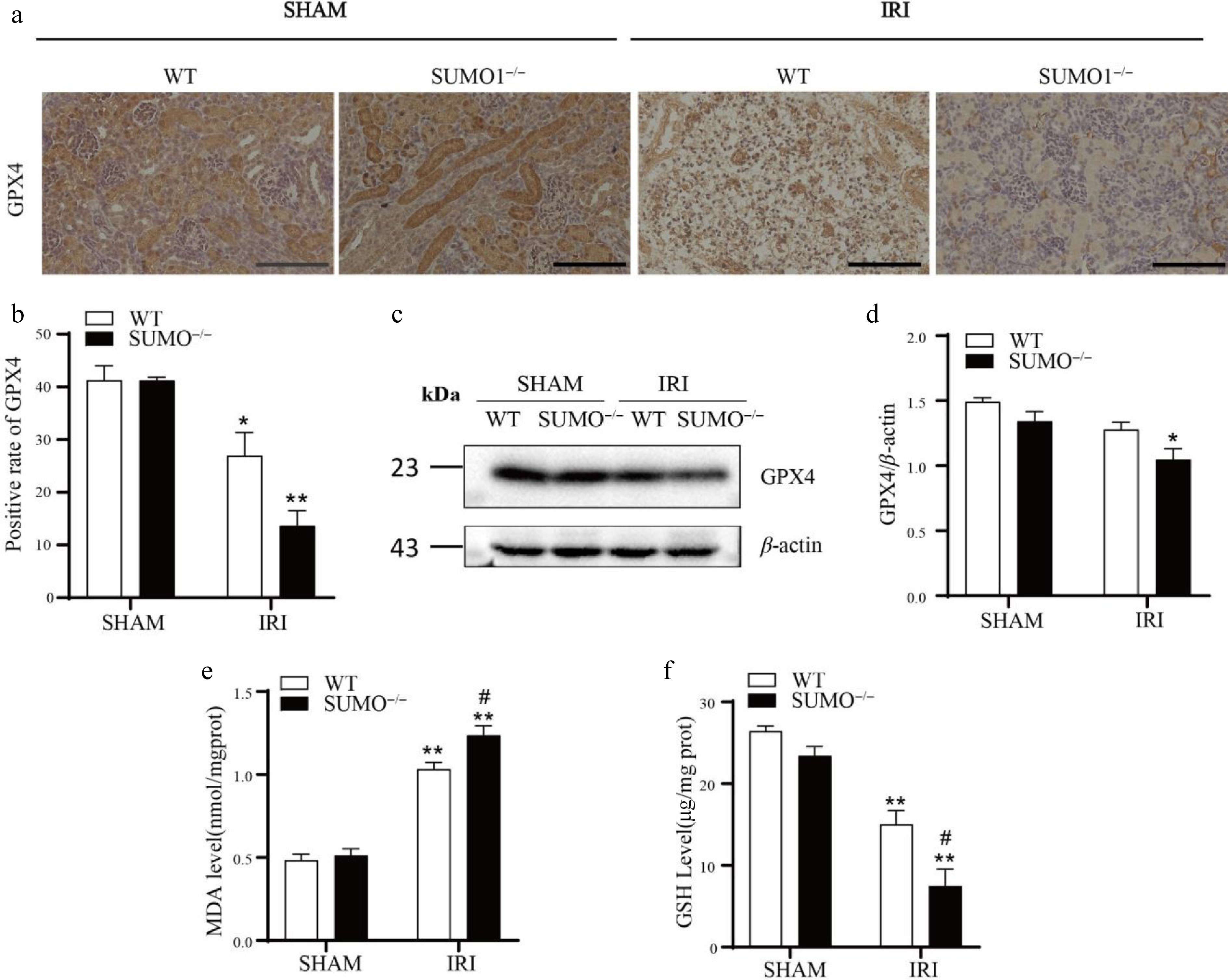 Knockout of SUMO1 increases IRI-induced ferroptosis. (a) IHC analysis of GPX4 expression in kidney tissue. Bar = 100 μm. (b) Quantitative analysis of GPX4-positive staining. N = 3. (c), (d) WB analysis of GPX4 protein levels in kidney tissue. N = 3. (e) Determination of MDA in renal tissue. N = 4. (f) Determination of GSH in renal tissue. N = 3. Data were presented as the means ± SEM. * p < 0.05, ** p < 0.01 vs isogenic mice received sham procedure; # p < 0.05 vs WT mice with renal IRI.