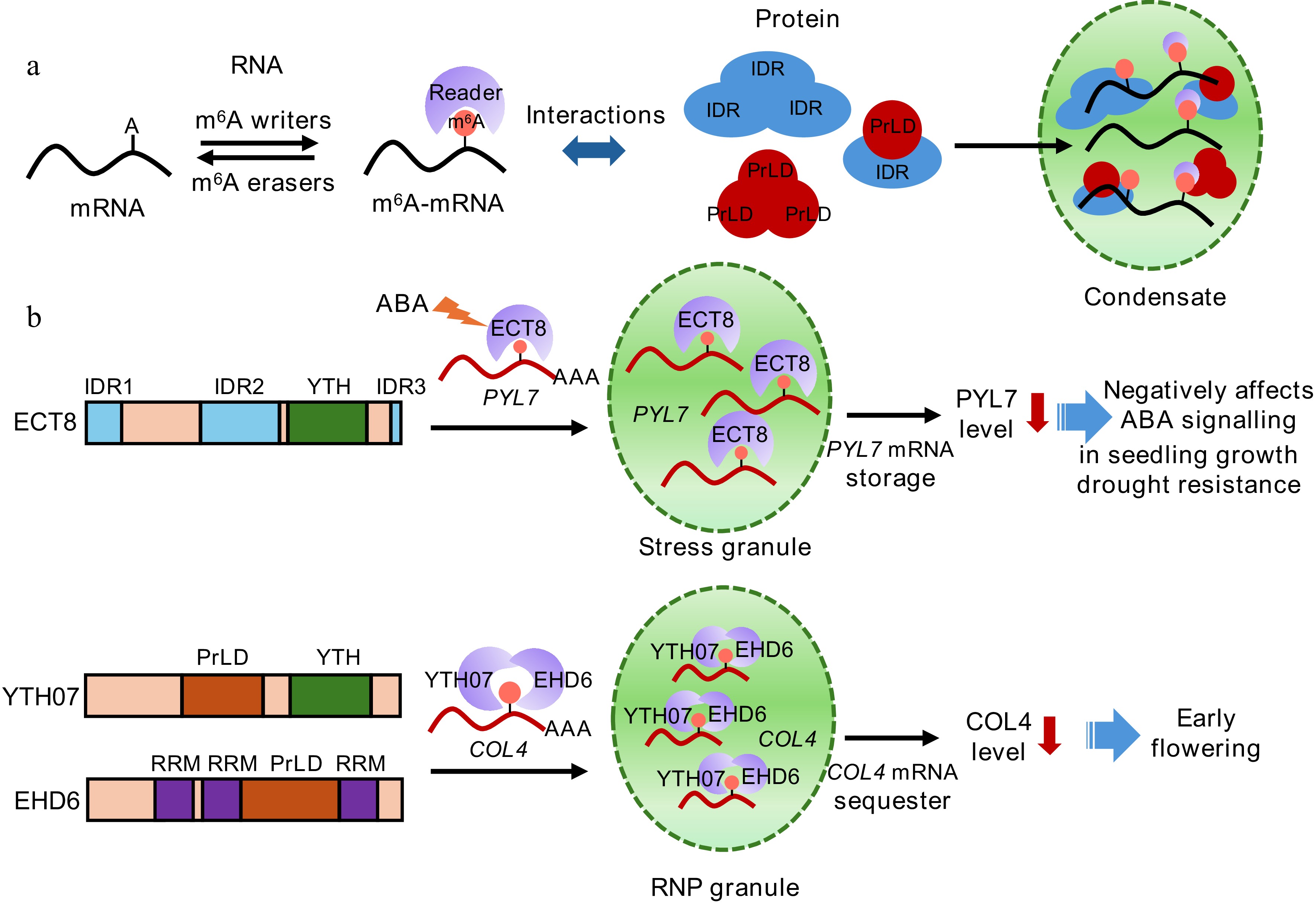 In one study, Wu et al. demonstrated that ABA signalling upregulates the m6A reader ECT8, triggers LLPS to form stress granules (SGs), where ECT8 temporarily sequesters m6A-marked transcripts of PYRABACTIN RESISTANCE 1-LIKE 7 (PYL7), reducing PYL7 mRNA for translation and negatively feedback regulating PYL7 levels and ABA signalling[26]. In another study, Cui et al. demonstrated that YTH07 interacts with Early Heading Date 6 (EHD6) in rice, sequestering the flowering repressor CONSTANS-like 4 (OsCOL4) mRNA into phase-separated condensates, resulting in early flowering[25]. Notably, as an RNA-binding protein (RBP), EHD6 physically interacts with YTH07 to enhance the m6A binding and relocation of YTH07 from the cytoplasm into ribonucleoprotein (RNP) granules through LLPS. This sequesters OsCOL4 mRNA and reduces its protein abundance[25] (Fig. 1).