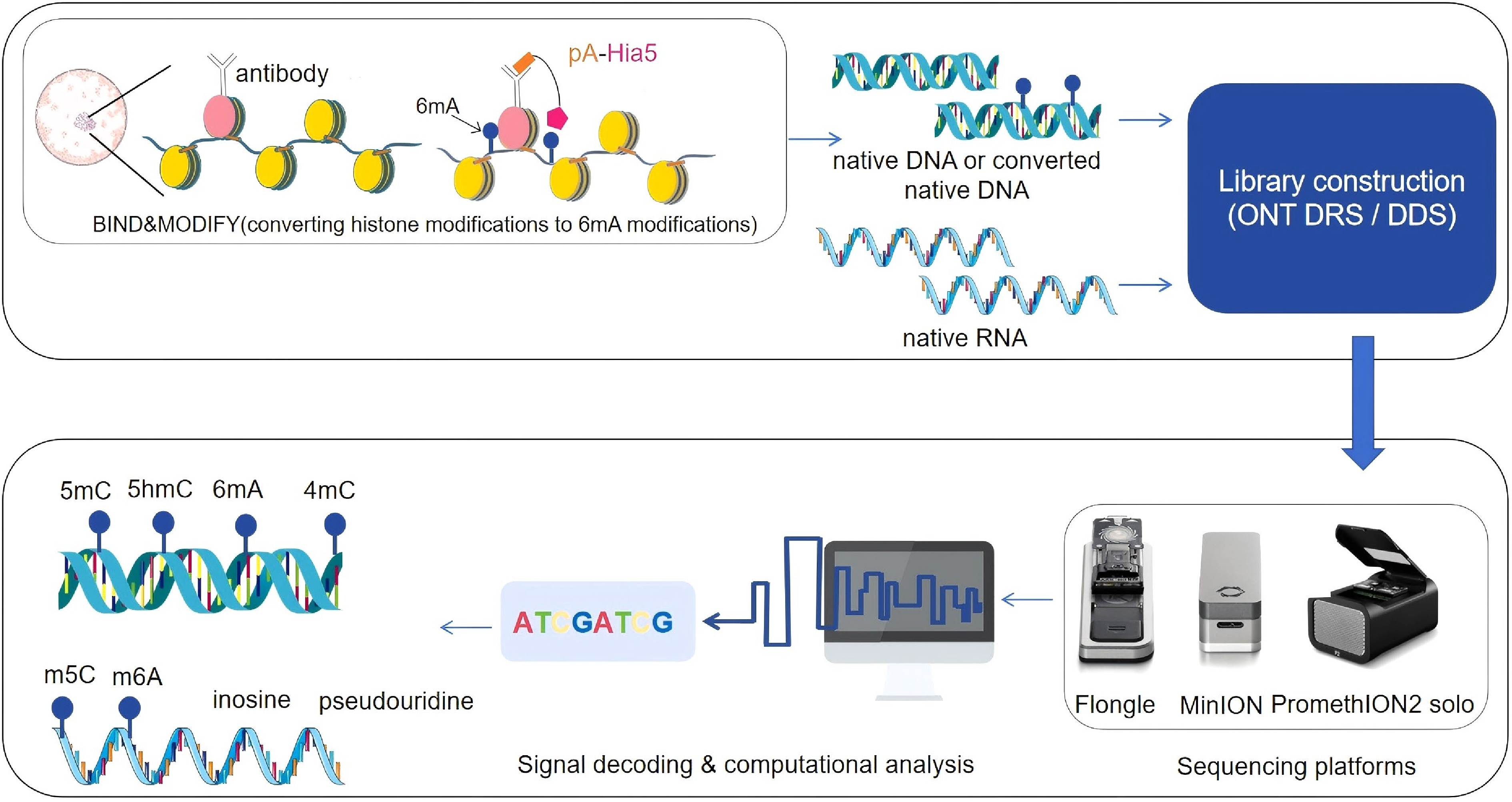 Critical limitations of current methodologies, however, impede accurate epigenome interrogation. Bisulfite sequencing (WGBS/RRBS), the gold standard for DNA methylation, relies on harsh bisulfite treatment to convert unmethylated cytosines to uracil. This process fragments DNA, destroys sequence context, and prevents recovery of intact molecules—resulting in low genomic coverage, regional biases, and challenges with limited clinical samples[6,7]. Crucially, it cannot distinguish 5 mC from 5 hmC, a key demethylation intermediate[8,9], nor detect non-cytosine modifications like N6-methyladenosine (m6A). Although enzymatic approaches (e.g., EM-Seq) mitigate DNA degradation and reduce input requirements[10], their conversion efficiency remains suboptimal for quantitative accuracy. Chromatin Immunoprecipitation sequencing (ChIP-seq) faces distinct hurdles: its dependence on antibody specificity and empirical optimization of cross-linking/sonication introduces lab-to-lab variability, masks cell-type-specific heterogeneity, and struggles with transient histone marks[11−13]. Microarray-based methods (e.g., MeDIP-chip) avoid bisulfite treatment but suffer from probe-dependent resolution limits, preventing discovery of novel modified regions[14], and cannot pinpoint exact modified bases[15]. Collectively, these constraints obscure native epigenetic states and dynamic processes.