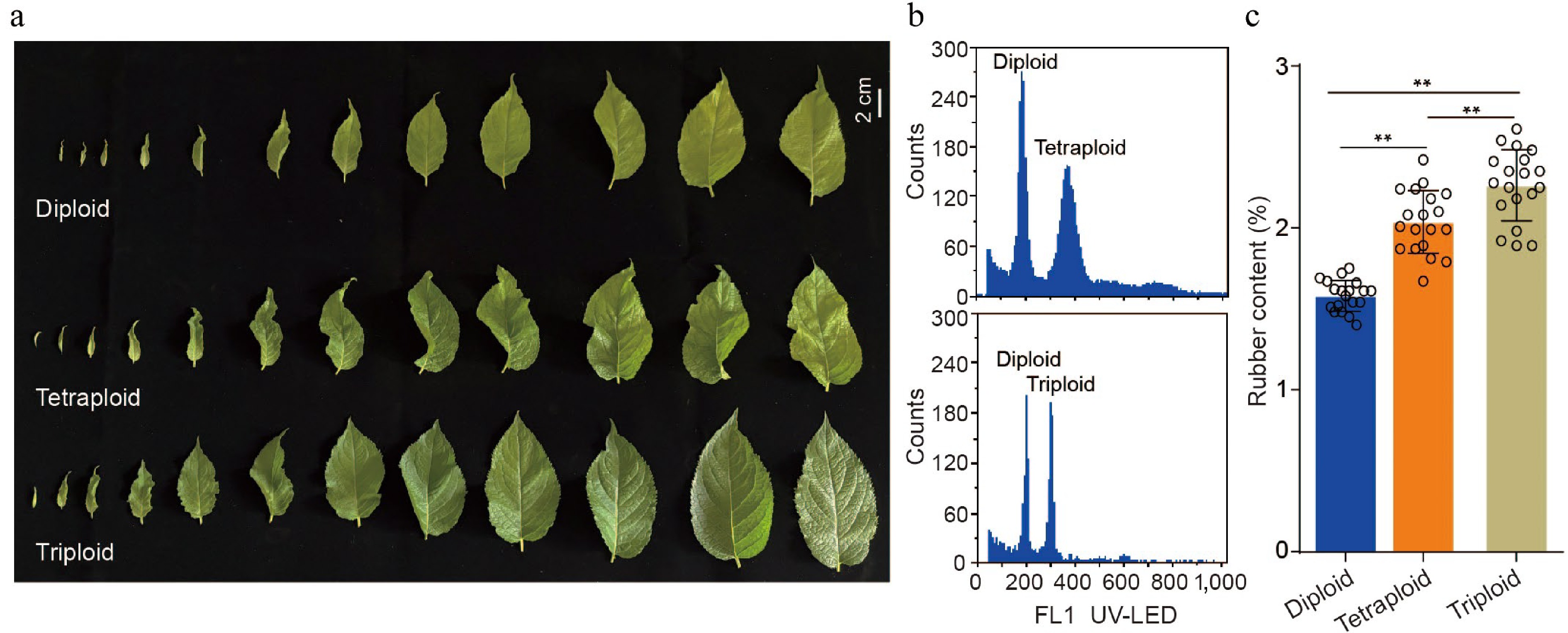 • In this work, new tetraploid germplasm of E. ulmoides was generated through colchicine-induced mutagenesis and subsequently created a new triploid variety by genetic hybridization, using ‘Huazhong No.10’ as the female parent and the colchicine-induced tetraploid as the male parent. Flow cytometry analysis is performed to determine the DNA content of the hybrid, which exhibited a distinct 3 C peak, whereas the diploid and tetraploid controls displayed characteristic 2 C and 4 C peaks, respectively (Fig. 1a, b). By assessing one-year-old grafted E. ulmoides seedlings, it is observed that a progressive increase in TPI content from diploid to tetraploid and then to triploid plants (Fig. 1c), highlighting the potential of the triploid variety as valuable germplasm for high-yield rubber breeding and further mechanistic studies.