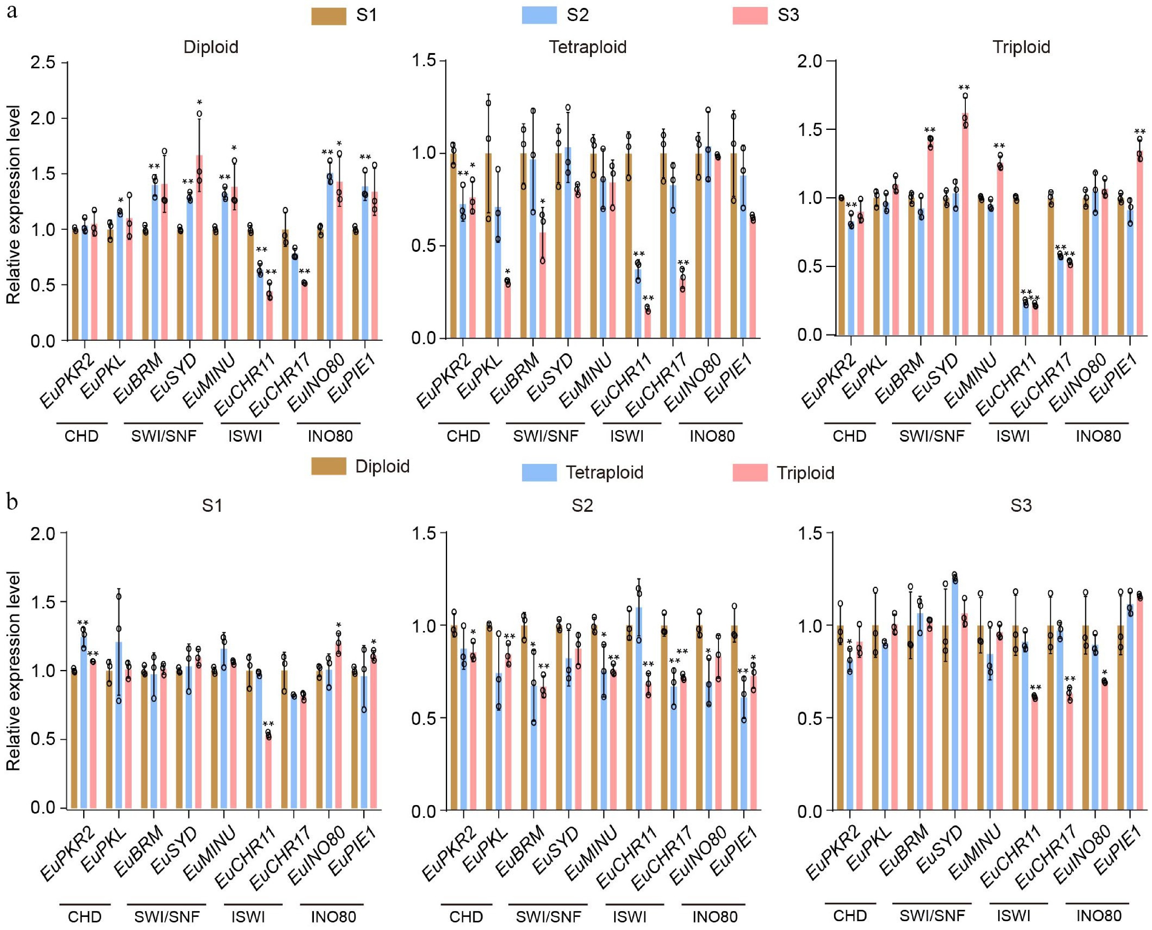 Transcript profiles of chromatin-remodeling enzymes in E. ulmoides. (a) The relative expression dynamics of chromatin-remodeling enzymes across three leaf developmental stages (S1: mid-to-late April; S2: mid-to-late May; S3: mid-to-late June) in diploid, tetraploid, and triploid plants. (b) The relative expression levels of chromatin-remodeling enzymes among diploid, tetraploid, and triploid at each individual developmental stage (S1 to S3). Values are means ± SD of three biological replicates. All p-values were obtained by two-tailed t-tests. * p < 0.05, and ** p < 0.01 represented the highly significant and significant difference, respectively.