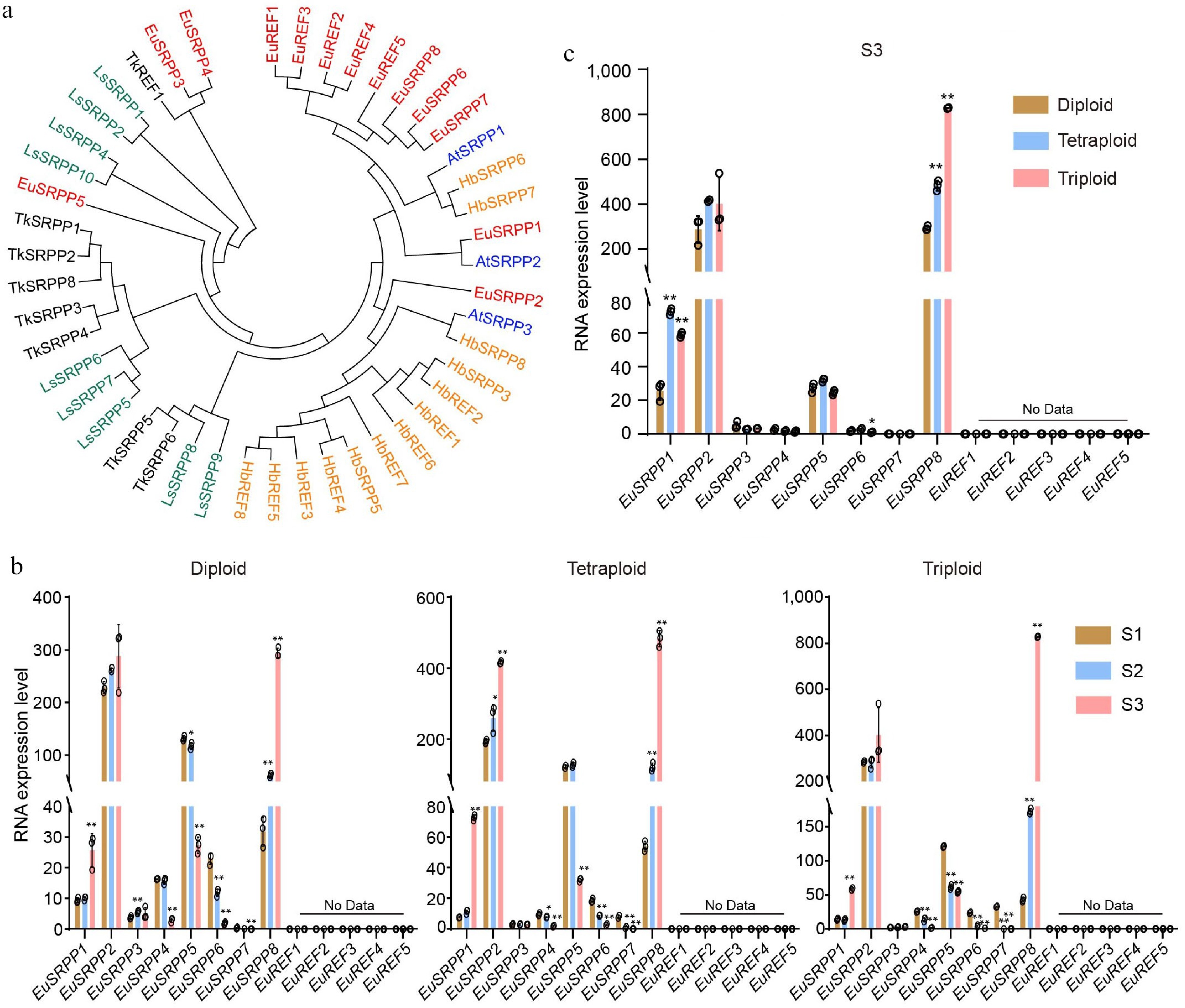 Transcript profiles of the EuSRPP/REF family genes in E. ulmoides. (a) Phylogenetic relationship of SRPP/REF genes in rubber synthesis plants (Hb: Hevea brasiliensis; Ls: Lactuca serriola; Tk: Taraxacum kok-saghyz; At: Arabidopsis thaliana). (b) The relative expression dynamics of EuSRPP/REF genes across leaf developmental stages (S1: mid-to-late April; S2: mid-to-late May; S3: mid-to-late June) in diploid, tetraploid, and triploid plants. (c) The relative expression levels of EuSRPP/REF genes among diploid, tetraploid, and triploid at stage S3. Values are means ± SD of three biological replicates. All p-values were obtained by two-tailed t-tests. * p < 0.05 and ** p < 0.01 represented the highly significant and significant difference, respectively.
