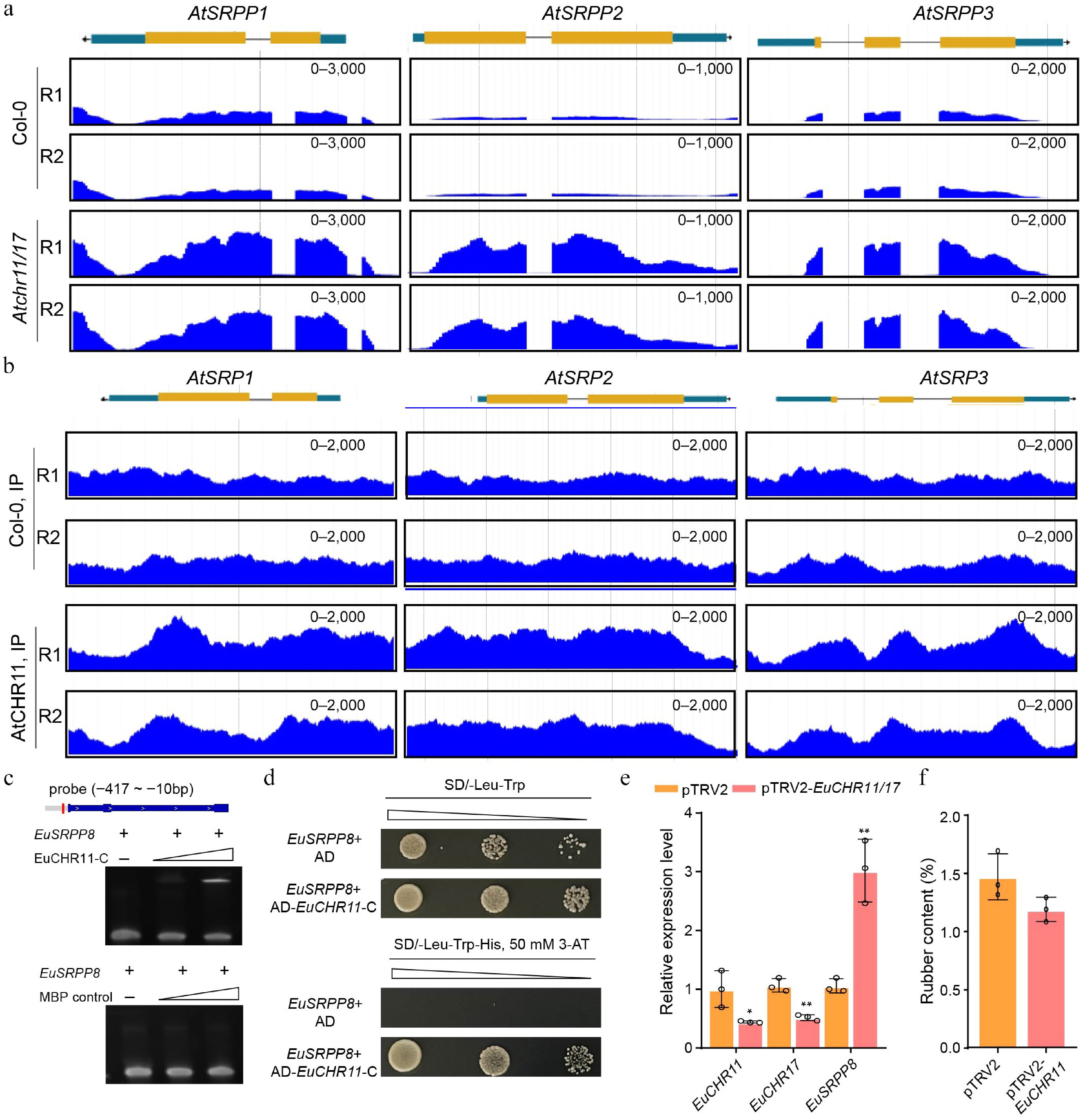 CHR11 negatively regulates the expression of the SRPP family genes in Arabidopsis and E. ulmoides. (a) Genome browser view of RNA-seq signals of AtSRPP1, AtSRPP2, and AtSRPP3 in the WT and Atchr11/17 double mutant. RPKM scale is shown for each panel. Data from two biological replicates are shown. (b) Genome browser view of AtCHR11 ChIP-seq peaks at the genomic loci of AtSRPP1, AtSRPP2, and AtSRPP3. RPKM scale is shown for each panel. Two replicates are shown. (c) EMSA showing the binding of EuCHR11-C to the EuSRPP8 promoter. The empty MBP protein was used as a negative control. (d) Y1H showing the binding of EuCHR11-C to the EuSRPP8 promoter. The empty AD vector was used as a negative control. (e) The relative expression levels of EuCHR11, EuCHR17 and EuSRPP8 genes infiltrated with TRV2 or TRV2-EuCHR11/17 vector. (f) Statistical analysis of TPI concentration in leaves infiltrated with TRV2 or TRV2-EuCHR11/17 vector. Values are means ± SD of three biological replicates. All p-values were obtained by two-tailed t-tests. * p < 0.05 and ** p < 0.01 represented the highly significant and significant difference, respectively.