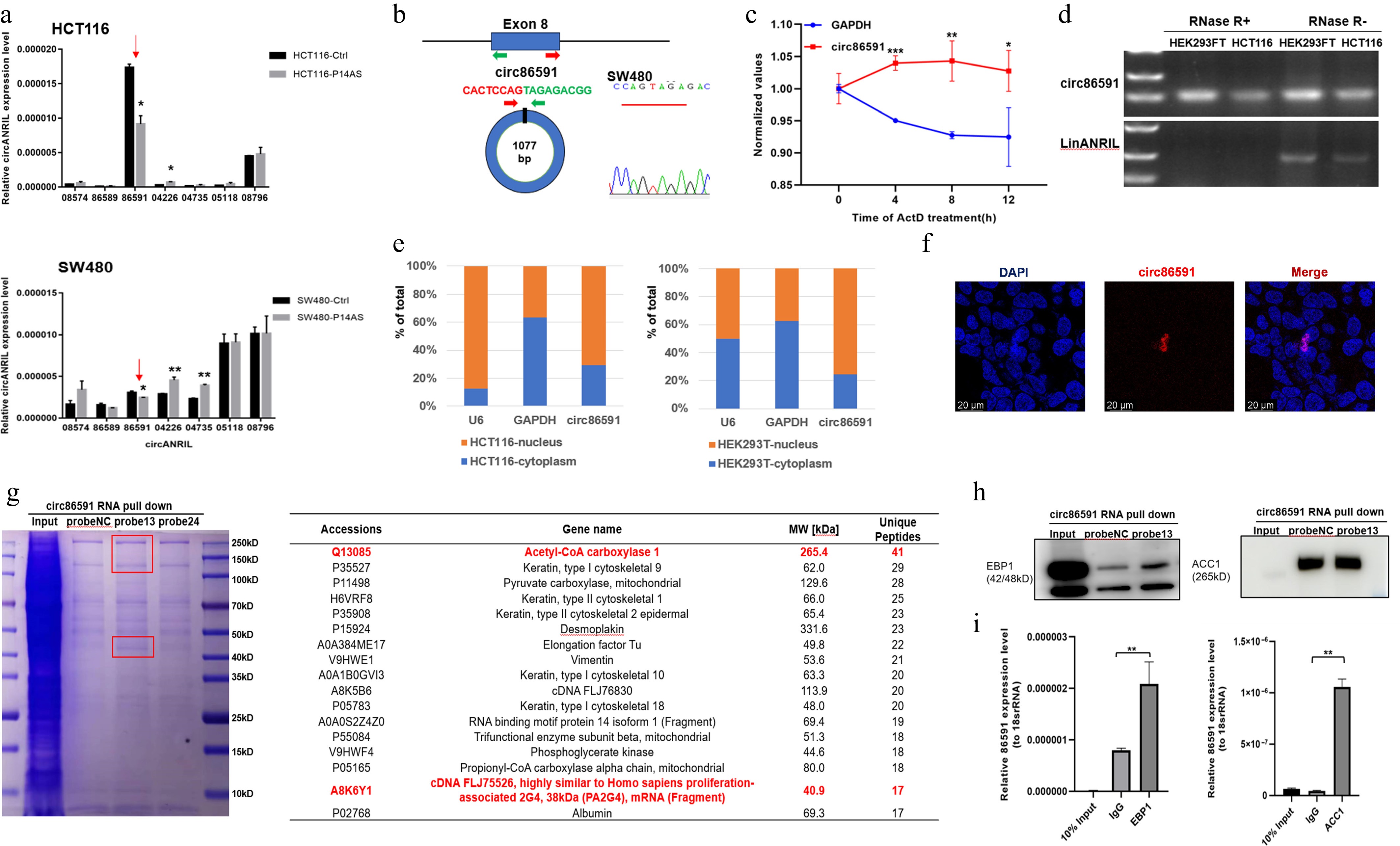 The identification and characteristics of circ86591. (a) Circ86591 was down-regulated in CRC cells with P14AS OE group compared with control group by qRT-PCR. (b) Schematic diagram indicating the circularization of exon8 of CDKN2B-AS formed circ86591. Sanger sequencing demonstrated the presence of circ86591 and its circularization characteristics. (c) SW480 cells were treated with Actinomycin D (5 μg/mL) for duration as indicated, followed by qRT-PCR analysis to examine the expression of circ86591 or GAPDH. (d) Total RNAs extracted from cells were incubated with or without RNase R at 37 °C for duration as indicated, followed by RT-PCR analysis to examine the expression of circ86591 or linANRIL. (e) Circ86591 expression in cytoplasm (GAPDH used as cytoplasmic control) and nucleus (U6 used as nuclear control) of HCT116 and HEK293T cells was detected by qRT-PCR which indicating the circ86591 was enriched in the nuclear of cells. (f) The analysis of the distribution of circ86591 by RNA-FISH assay in HEK293T cells. (g) Biotin-labeled circ86591 pull-down complexes from cell lysate, following mass spectrometry. (h) Western blot analyses of circ86591-EBP1 and ACC1 complexes. (i) High levels of circ86591 were detected by RIP-PCR assay with an anti-EBP1 or anti-ACC1 antibody in HEK293T cells. IgG antibody acted as a negative control.