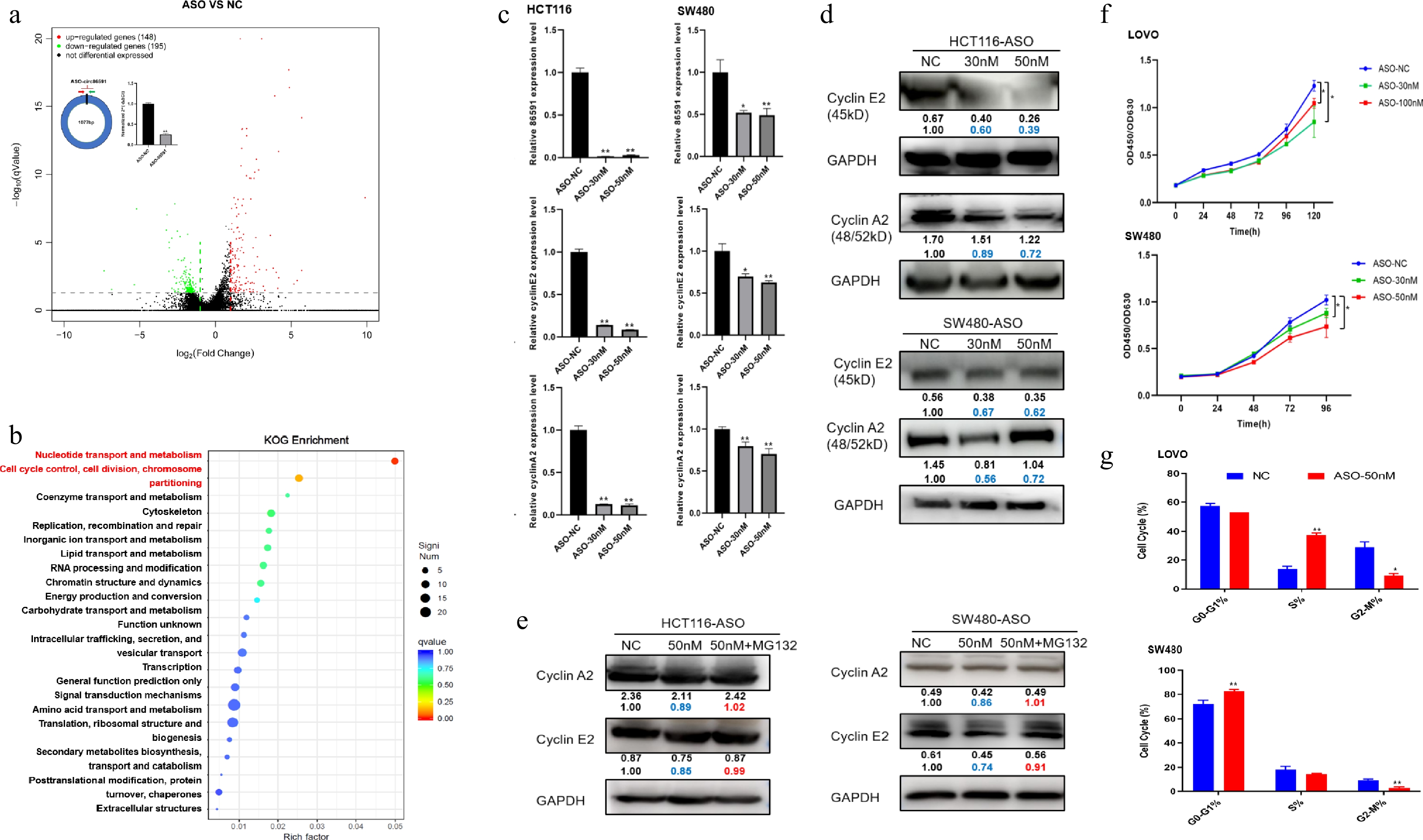 Circ86591 affected cell cycle pathway through binding EBP1 protein. (a) The LOVO cells transfected with ASO-NC or ASO-circ86591 were subjected to qRT-PCR to examine the expression of circ86591. The volcano plot showing the expression profile of LOVO cells with ASO-NC and ASO-circ86591. (b) The KOG analysis for genes positively regulated by circ86591 knockdown was shown. (c) The qRT-PCR, and (d) WB assays confirmed the downregulation of CCNE2 and CCNA2 involved in cell cycle in circ86591 knockdown cells. (e) The WB assay was used to detect the protein levels of CCNE2 and CCNA2 after MG132 drug treatment in HCT116 and SW480 cells transfected with ASO-NC or ASO-circ86591. (f) The CCK8 assay exhibited changed in the growth of LOVO and SW480 cells with circ86591 knockdown compared with controls. (g) Flow cytometry indicated that the G0-G1 and S phase arrest in the cells with circ86591 knockdown compared with controls.