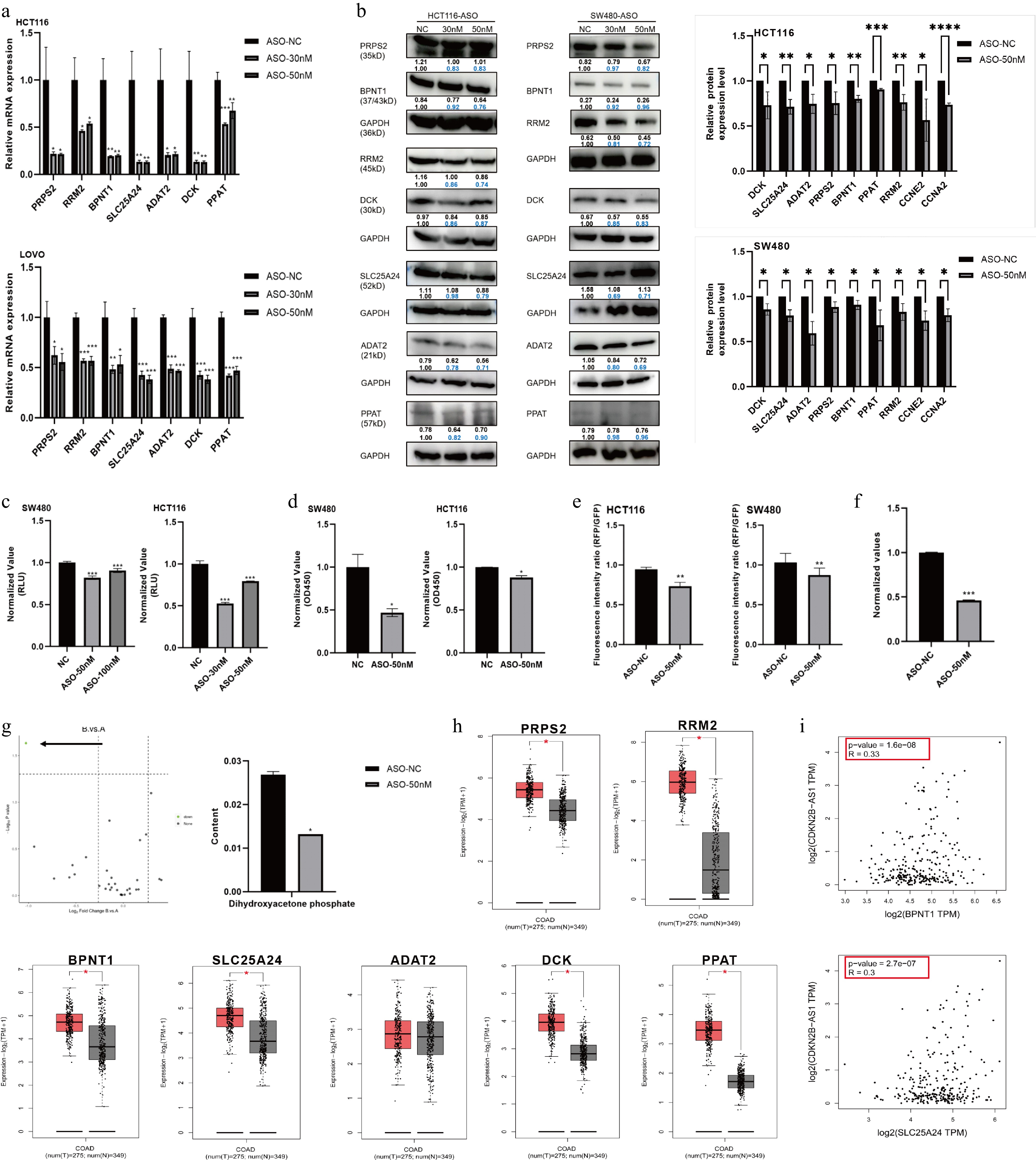 circ86591 knockdown influence energy metabolism including nucleotide metabolism in CRC cells. The (a) qRT-PCR, and (b) WB assays confirmed the downregulation of genes involved in nucleotide metabolism in circ86591 knockdown cells. (c) The ATP assay exhibited changes in the ATP content of HCT116 and SW480 cells with circ86591 knockdown compared with controls. (d) The NAD+/NADH assay exhibited changes in the content of HCT116 and SW480 cells with circ86591 knockdown compared with controls. (e) The JC-1 MitoMP detection kit showed changes in the mitochondrial membrane potential abilities of HCT116 and SW480 cells with circ86591 knockdown compared with controls. (f) The L-Lactic Acid (LA) colorimetric assay kit exhibited changes in the lactate content of SW480 cells with circ86591 knockdown compared with controls. (g) The mass spectrometry analysis showed that the content of DHAP decreased in the ASO-circ86591 group compared with controls. (h) The genes regulated by circ86591 were up-regulated in COAD tissues compared with normal tissues. (i) The GEPIA database analysis of BPNT1 and SLC25A24 expression were positively correlated with CDKN2B-AS1.