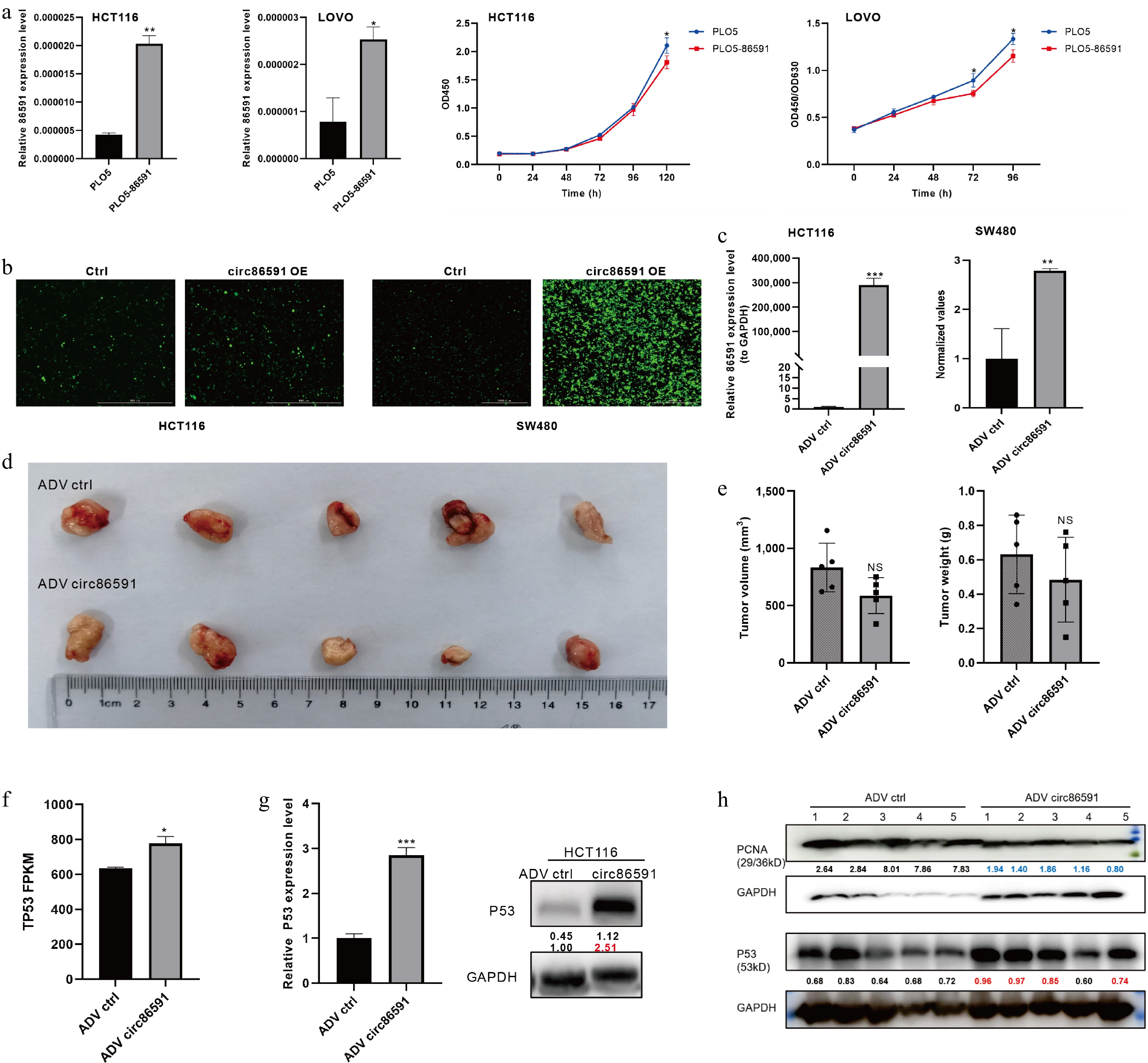 The effect of circ86591 in vivo. (a) The up-regulated circ86591 in HCT116 and LOVO cells were detected by qRT-PCR and the CCK8 assay exhibiting changes in the growth of CRC cells with circ86591 overexpression compared with controls. (b) The green protein expression of HCT116 and SW480 cells infected with ADV ctrl or ADV circ86591 were showed by fluorescence microscopy. (c) The qRT-PCR assay confirmed the overexpression of circ86591 in ADV ctrl and ADV circ86591 group. (d) NVSG mice were subcutaneously implanted with HCT116 cells, and treated with ADV ctrl or ADV circ86591 for three weeks (once per week) and the tumors were collected and photographed. (e) The volume and weight of tumors as described in (d) was shown. (f) The RNA-seq analysis of P53 gene expression level between ADV ctrl and ADV circ86591 group. (g) The WB assay confirmed the elevation of P53 protein levels in HCT116 cells after infection with ADV circ86591. (h) The P53 and PCNA protein levels in tumor of (d) were detected by the WB assay.