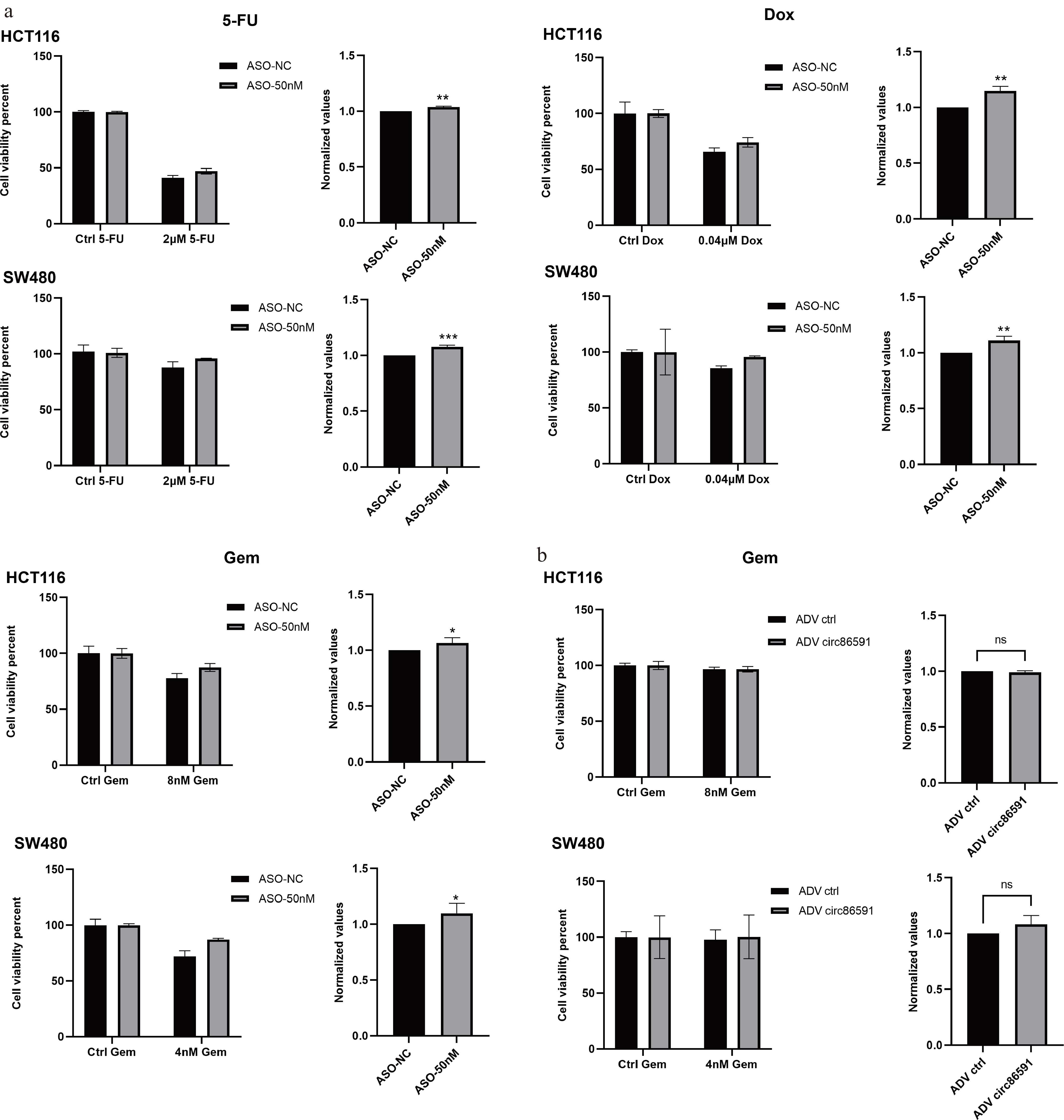 circ86591 knockdown could increase drug resistance in CRC cells. (a) The CCK8 assay was performed for cell survival after drug treatment in ASO-NC and ASO- circ86591 groups. (b) The CCK8 assay was performed for cell survival after GEM treatment in ADV ctrl and ADV circ86591 groups.