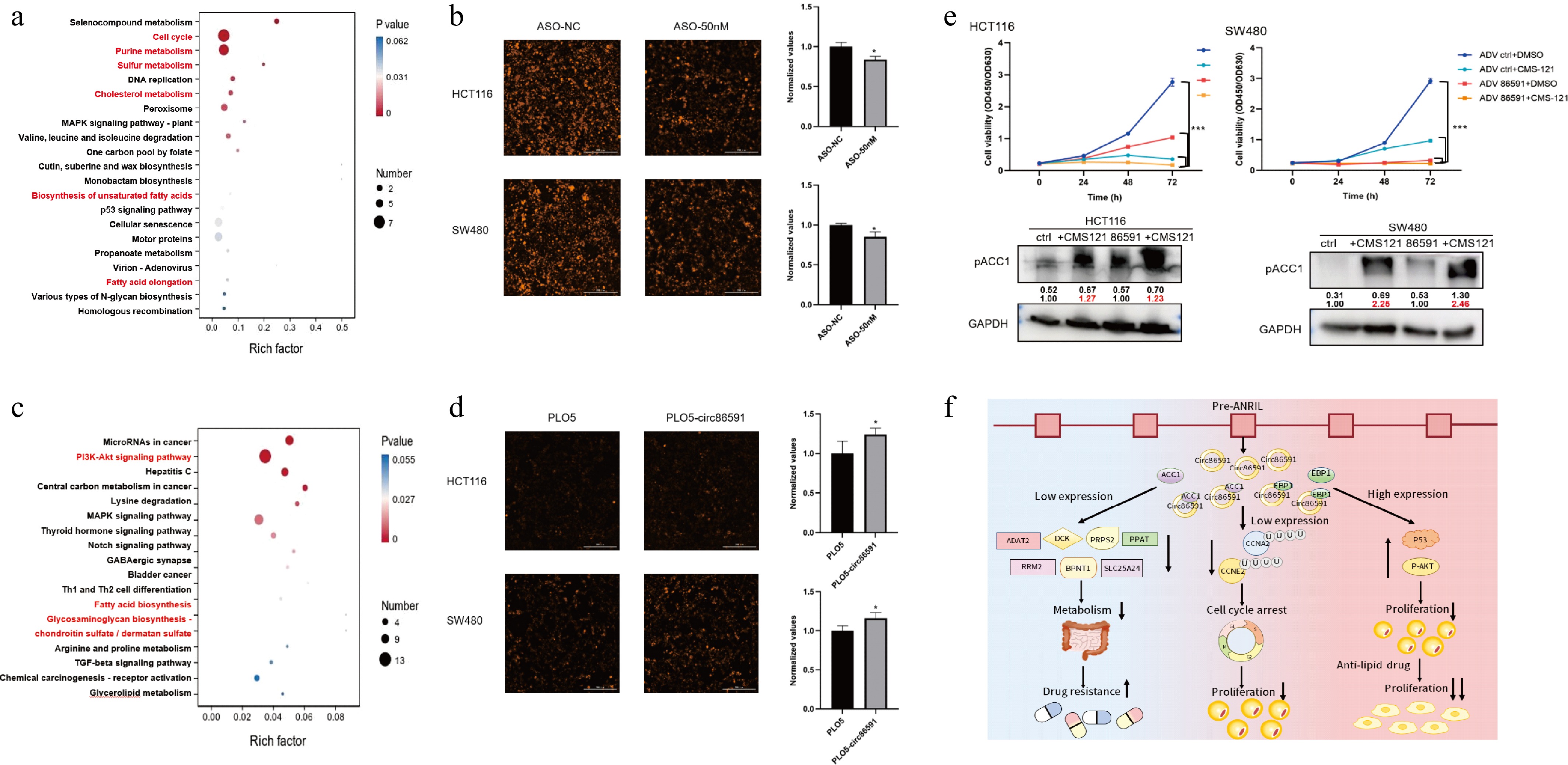 circ86591 was related to lipid metabolic pathway via analysis of RNA-seq. (a) The KEGG analysis for genes positively regulated by circ86591 knockdown was shown. (b) Fluorescence microscopy was used to observe lipid droplet synthesis in the ASO-circ86591 or ASO-NC group, and three fields of view were randomly selected for fluorescence intensity analysis. (c)The KEGG analysis for genes positively regulated by circ86591 overexpression was shown. (d) Fluorescence microscopy was used to observe lipid droplet synthesis in the ADV circ86591 or ADV ctrl group, and three fields of view were randomly selected for fluorescence intensity analysis. (e) The HCT116 and SW480 cells infected with ADV ctrl or ADV circ86591 combined with DMSO or CMS121 were subjected to cell proliferation assay (up) and WB assay (below). (f) Schematic representation of the functional role of circ86591.