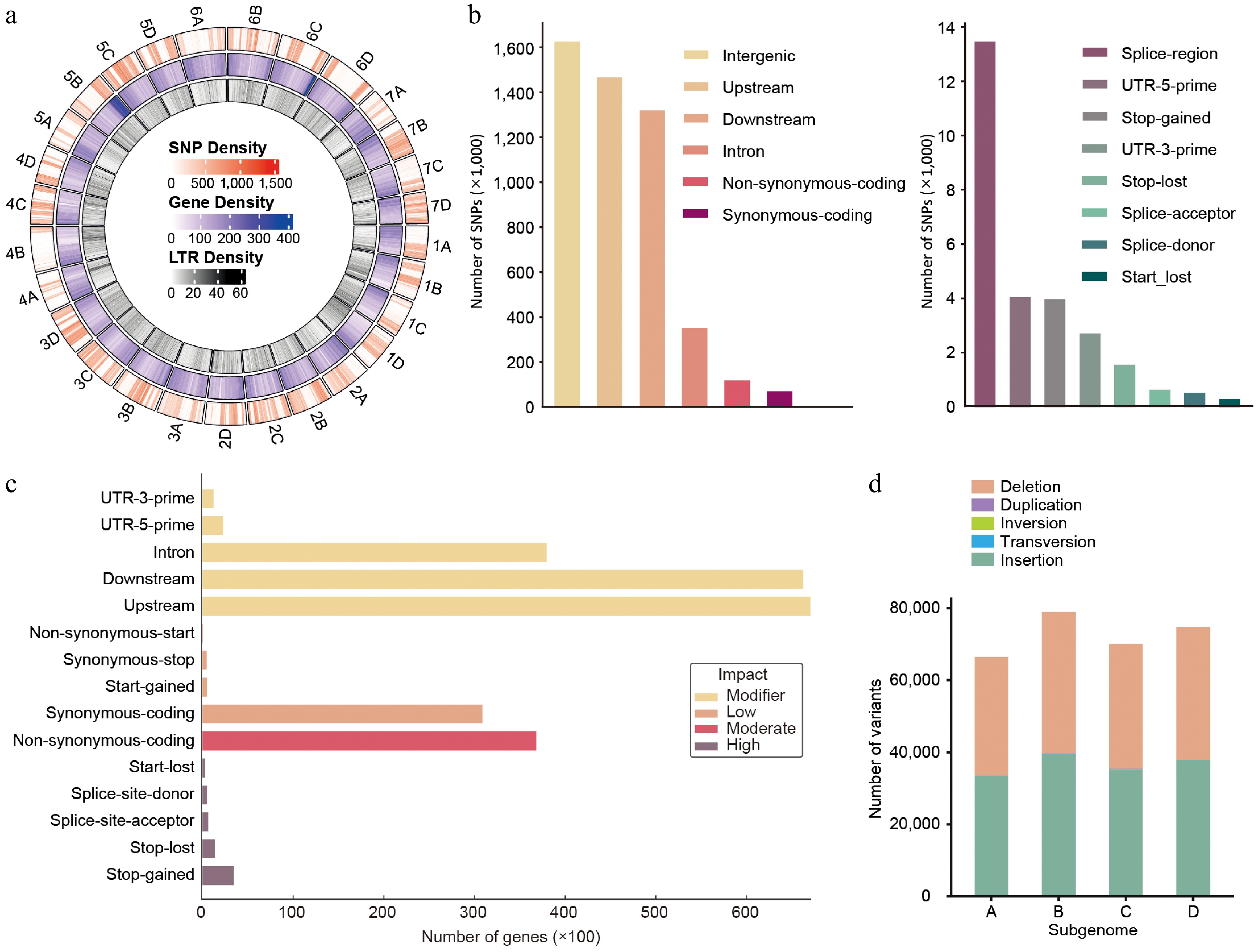 Genome-wide distribution and annotation of SNPs and structural variants between 'Florida Brilliance' and 'Seolhyang' strawberries. (a) Circos plot showing genome-wide distributions of SNP density (outermost ring, red), gene density (middle ring, blue), and LTR density (innermost ring, green) across the chromosomes of the analyzed Seolhyang reference genome. Whole-genome resequencing (WGS) data of Brilliance was aligned to the Seolhyang reference genome for this analysis. (b) Functional classification of SNPs according to genomic context. Left panel: most SNPs are located in intergenic, upstream, or downstream regions. Right panel: SNPs within coding and regulatory regions, including splice sites and UTRs. (c) The number of genes harboring SNPs, classified based on their predicted functional impact into four categories: modifier, low, moderate, and high. (d) Distribution of structural variants (SVs), including deletions, duplications, inversions, transversions, and insertions across four subgenomes A–D.