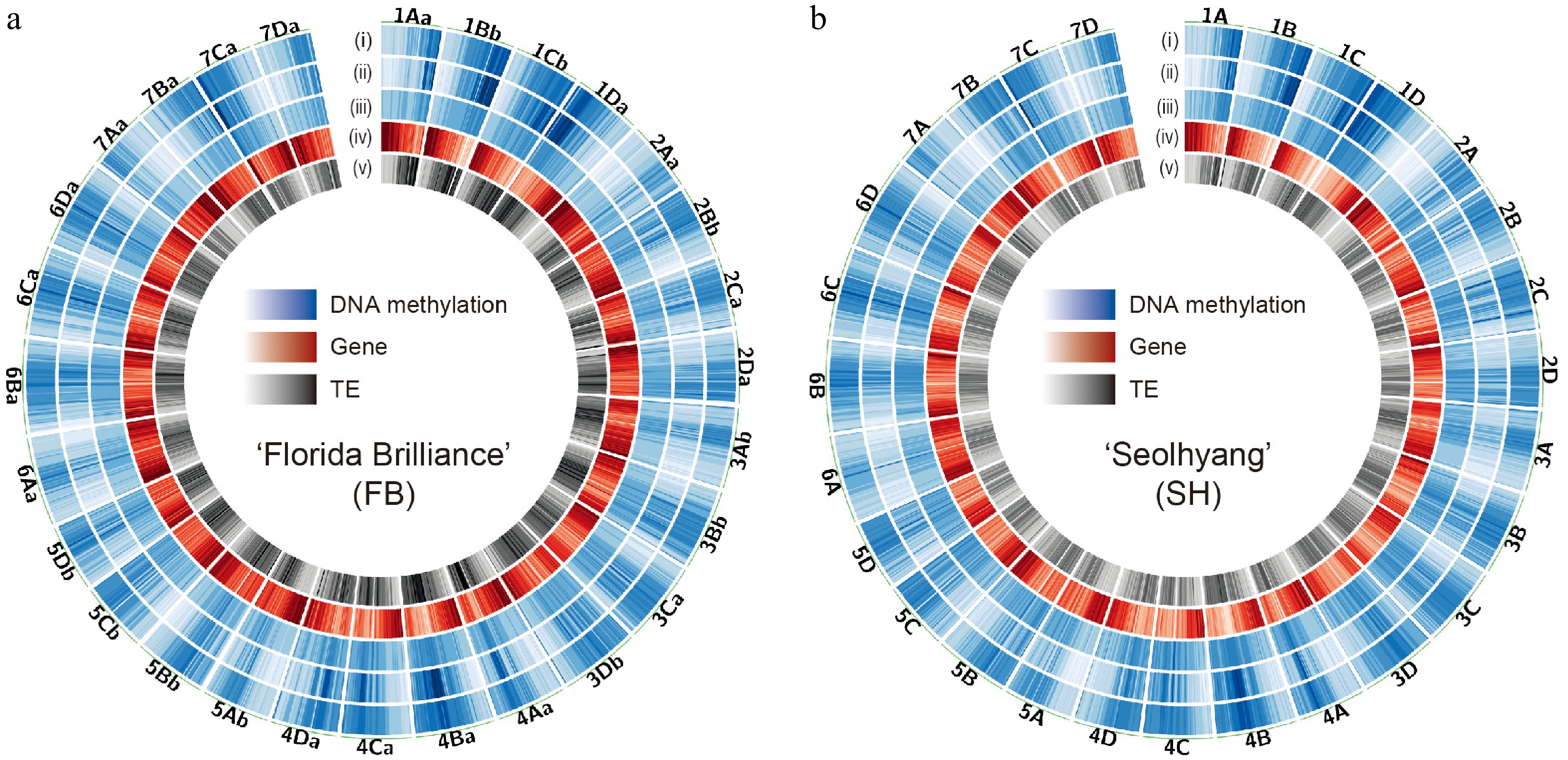 Genome-wide DNA methylation landscape of octoploid strawberry cultivars. Circos plots showing the genome-wide distribution of DNA methylation in (a) 'Florida Brilliance' (FB), and (b) 'Seolhyang' (SH). Each track indicates the density of (i) mCG, (ii) mCHG, (iii) mCHH, (iv) genes, and (v) TEs from the outside. The density scales are as follows: mCG (0–1), mCHG (0–0.6), mCHH (0–0.1), genes (0–100), and TEs (0–774). Methylation levels and feature densities were calculated in non-overlapping 500-kb windows across the genome.