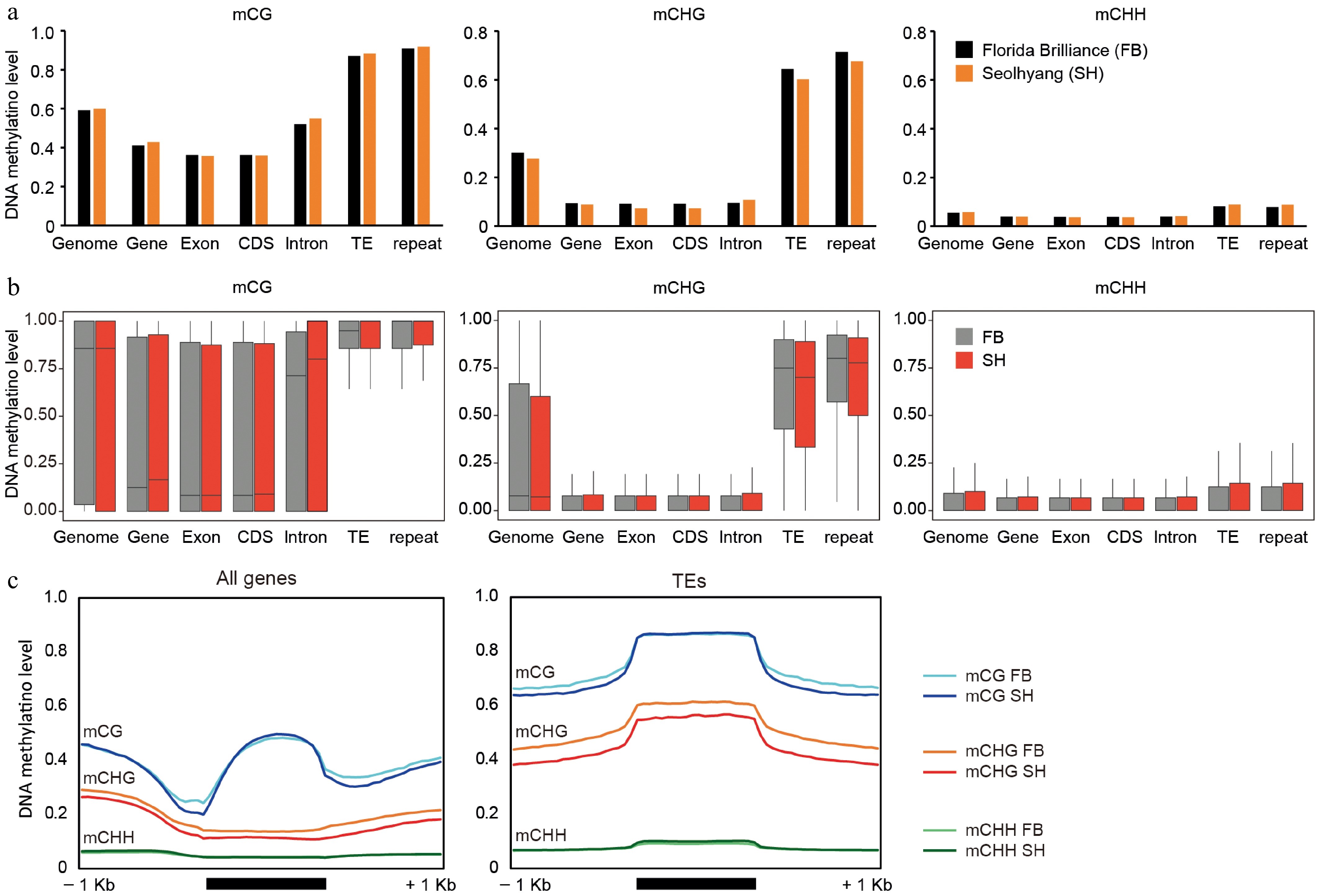 • To investigate genome-wide DNA methylation landscapes, we performed WGBS on leaf tissues from the octoploid strawberry cultivars FB and SH. Given that both high-quality FB and SH genomes have recently been assembled[30,31], WGBS reads were aligned to their respective cultivar-specific reference genomes to maximize mapping accuracy. This strategy yielded mapping rates of 51.3% for FB and 49.0% for SH (Supplementary Table S1). In contrast, reciprocal mapping to the alternate genome resulted in lower mapping rates (37.7% for FB and 38.2% for SH), indicating over 10% improvement of mapping rate when using the corresponding genome. We further evaluated overall genome coverage as well as cytosine-level coverage across the genome. The proportion of cytosines covered by three or more reads reached 88.4% in FB and 85.0% in SH, with an average sequencing depth of 28.3× for FB and 20.7× for SH (Supplementary Table S1). Together, these results support the robustness of our WGBS datasets for downstream methylome analysis.