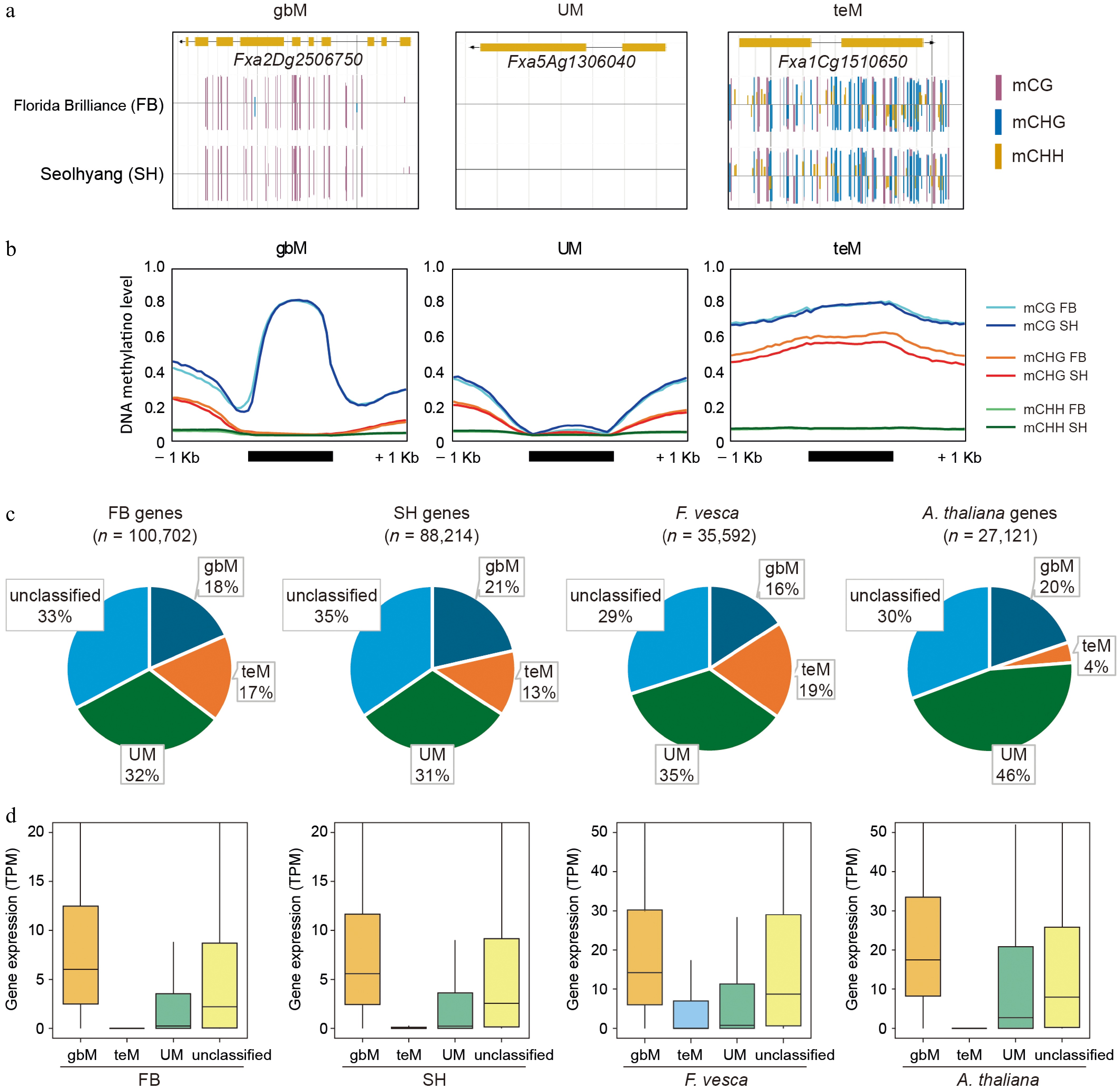 Classification and comparison of gene methylation patterns in octoploid strawberry cultivars. (a) Representative genome browser views of genes classified as CG gene body methylated (gbM), unmethylated (UM), and TE-like methylated (teM) in FB and SH. Methylation contexts are indicated by colored bars: mCG (magenta), mCHG (blue), and mCHH (yellow). (b) Metaplots showing DNA methylation levels across 1-kb upstream and downstream regions of gbM, UM, and teM genes, where average methylation levels were calculated by dividing each region into 20 equal bins and computing the mean ratio of methylated to total cytosine reads within each bin. (c) Pie charts representing the proportions of gbM, teM, UM, and unclassified genes in FB, SH, Fragaria vesca, and Arabidopsis thaliana. (d) Boxplots showing gene expression levels (TPM) for each methylation category (gbM, teM, UM, and unclassified) in FB, SH, F. vesca, and A. thaliana.