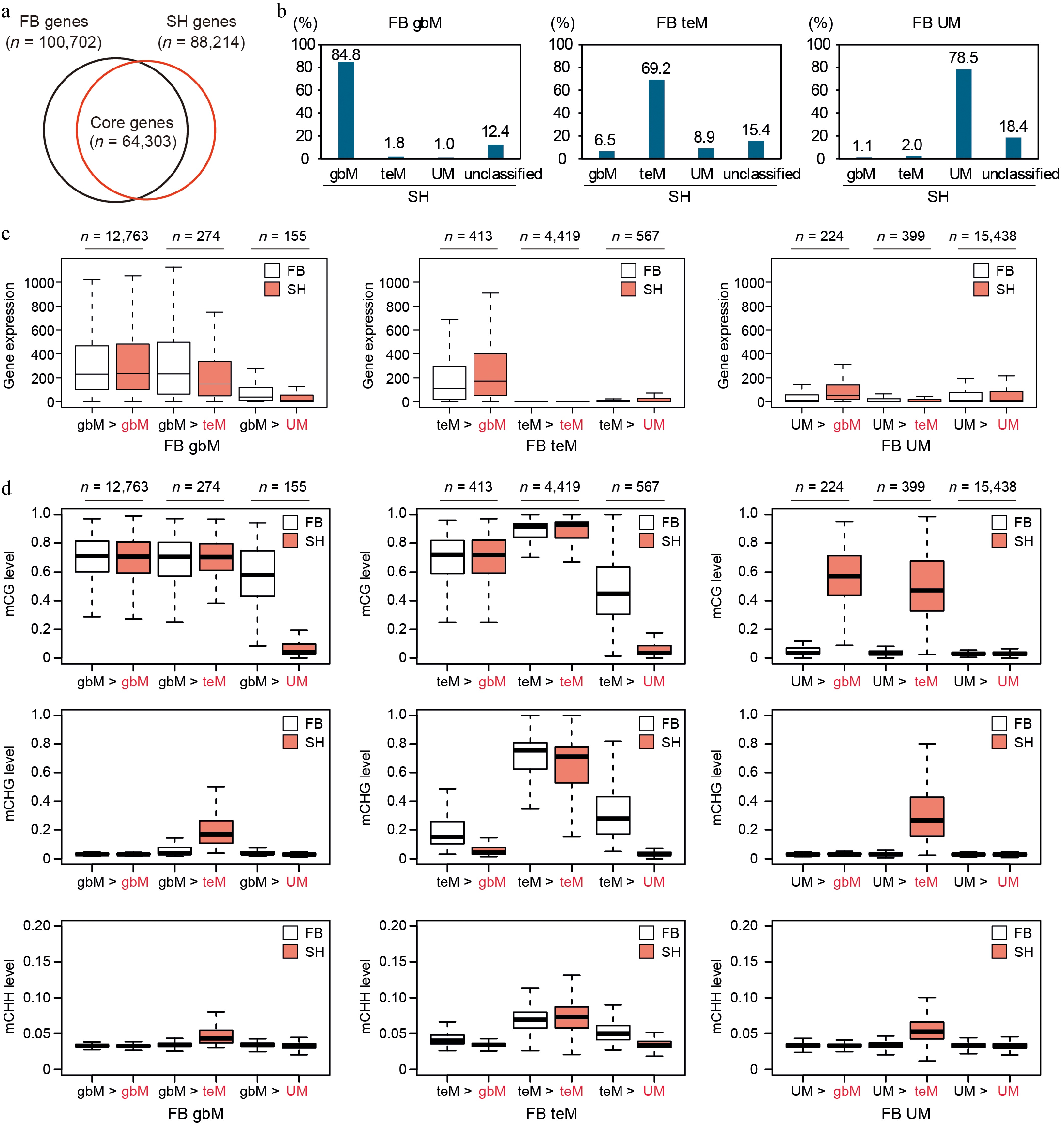 Conservation and dynamics of gene body methylation and gene expression between FB and SH. (a) Venn diagram showing the overlap of predicted genes between FB and SH. A total of 64,303 genes with one-to-one reciprocal best BLAST hits at the protein level were defined as core genes and used for the analyses in panels (b)–(d). (b) Transition of DNA methylation classification (gbM, teM, UM) of FB genes in SH. For each methylation category in FB (gbM, teM, and UM), the percentage of genes that retained or shifted their methylation classification in SH is shown. (c) Gene expression levels normalized for gene length and library size, and (d) DNA methylation levels in FB (white) and SH (red) across transition categories. Each panel compares the expression of genes classified as gbM, teM, or UM in FB, grouped by their corresponding methylation category in SH.