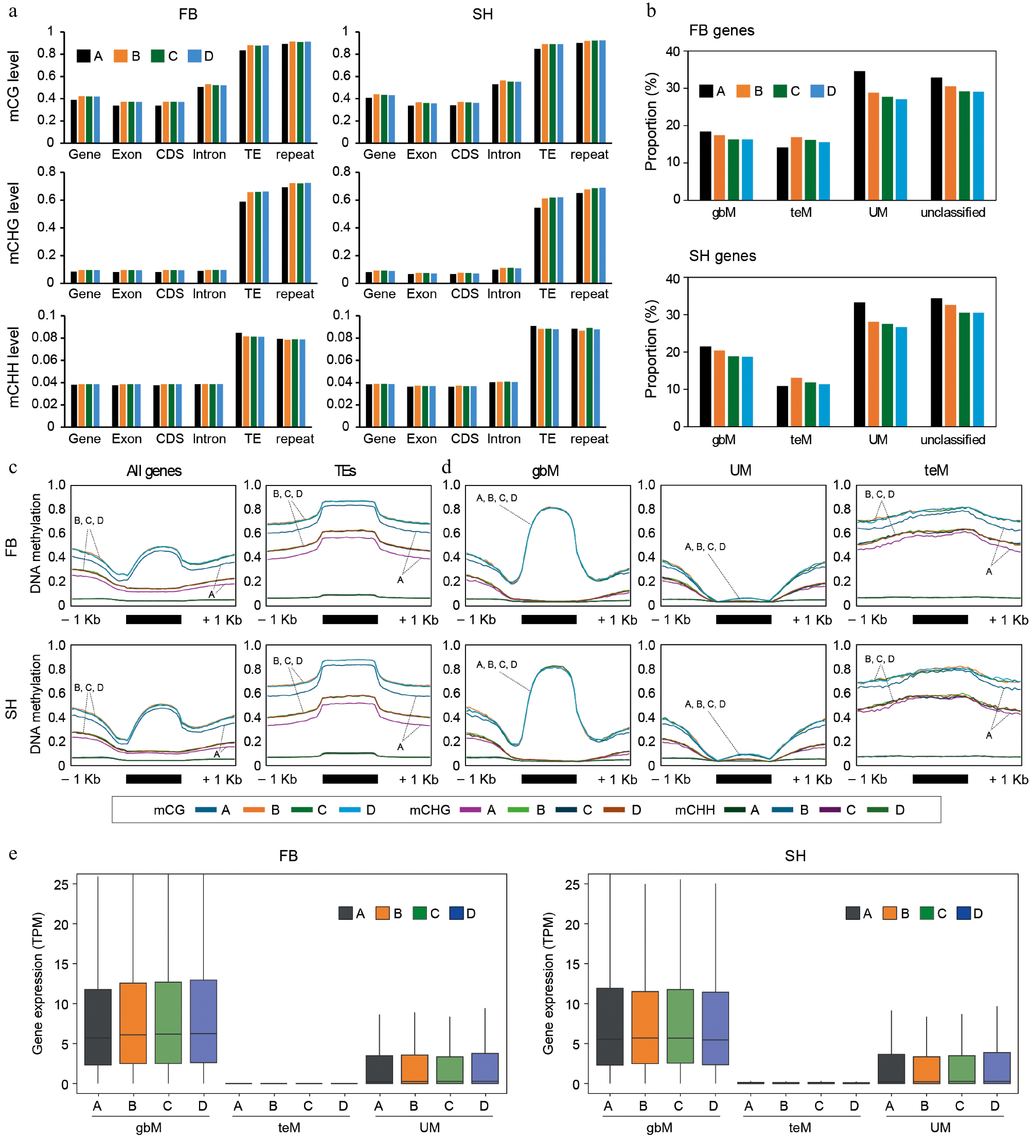 All annotated genes in FB (n = 100,702) and SH (n = 88,214) were classified into gbM, teM, and UM categories based on the criteria described above. The relative proportions of genes in each methylation category for both cultivars are summarized as pie charts. To investigate the divergence of gene body methylation between FB and SH, SynOrths v1.0[40] was used to identify 1:1 orthologous genes based on reciprocal BLASTP and synteny conservation. The resulting syntenic orthologs were defined as a core gene set (n = 64,303) for downstream comparative analysis of methylation and expression.