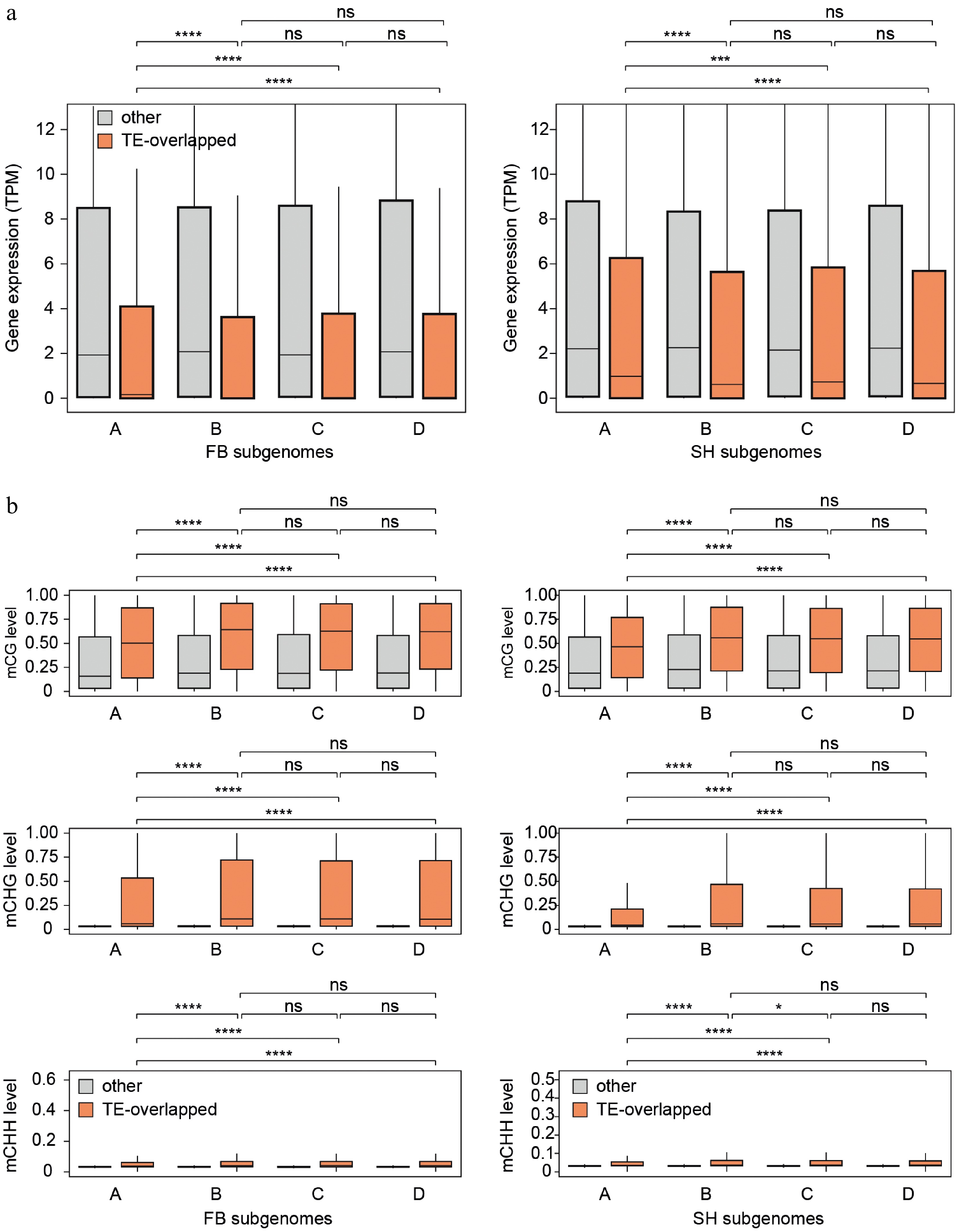 To further assess whether subgenome-specific TE hypomethylation affects nearby gene expression, we categorized all annotated genes into two groups: those overlapped with TEs and those that were not. In total, 38,057 TE-overlapping genes in FB and 33,916 genes in SH were identified (Supplementary Table S7) and compared to the remaining non-overlapping genes. We then evaluated gene expression and methylation levels separately across subgenomes (Fig. 7). Notably, in both cultivars, only subgenome A showed significantly elevated expression of TE-overlapping genes relative to the same group in subgenomes B–D (Wilcoxon test, p < 0.001). This elevated expression coincided with significantly lower CG and CHG methylation levels in subgenome A, consistent with the genome-wide methylation patterns previously observed. In contrast, for the 'other' non-TE-overlapping gene group, no significant expression or methylation differences were detected across subgenomes. These results suggest that the uniquely low TE methylation in subgenome A facilitates increased expression of nearby genes, providing direct evidence that subgenome-specific methylation states can exert functional regulatory influence.