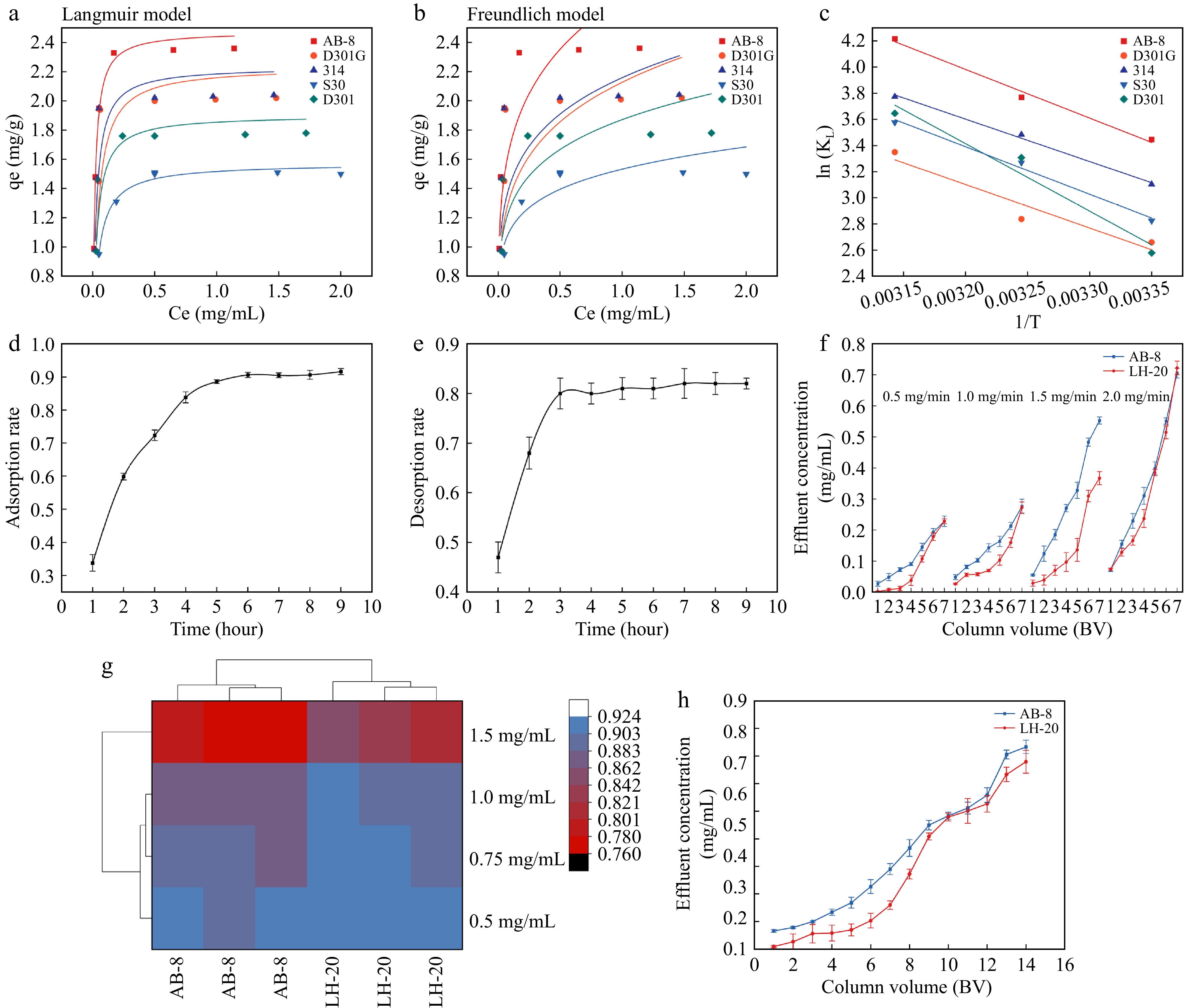 Langmuir model and Freundlich model fitting and optimization of loading parameters. (a) Langmuir model fitting for PAs at 25 °C. (b) Freundlich model fitting for PAs at 25 °C. (c) Linear fitting of lnKL and 1/T. (d) Static adsorption curve of proanthocyanidins by AB-8 macroporous resin. (e) Static desorption curve of proanthocyanidins by AB-8 macroporous resin. (f) Influence of sample loading velocity on dynamic tannin adsorption efficiency under resin and gel loading chromatographic column. (g) Influence of sample concentration on dynamic tannin adsorption efficiency under resin and gel loading chromatographic column. (h) Dynamic tannin adsorption curve under resin and gel loading chromatographic column.